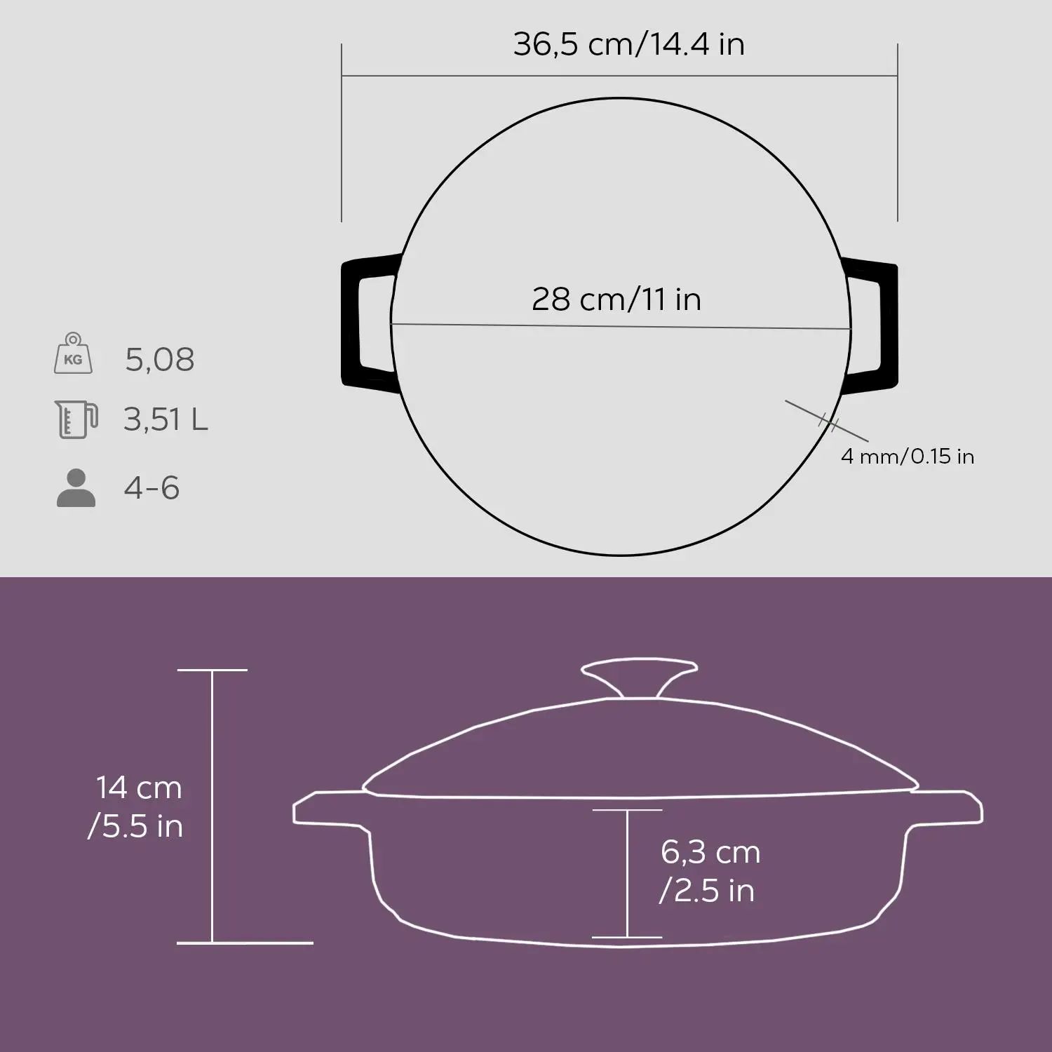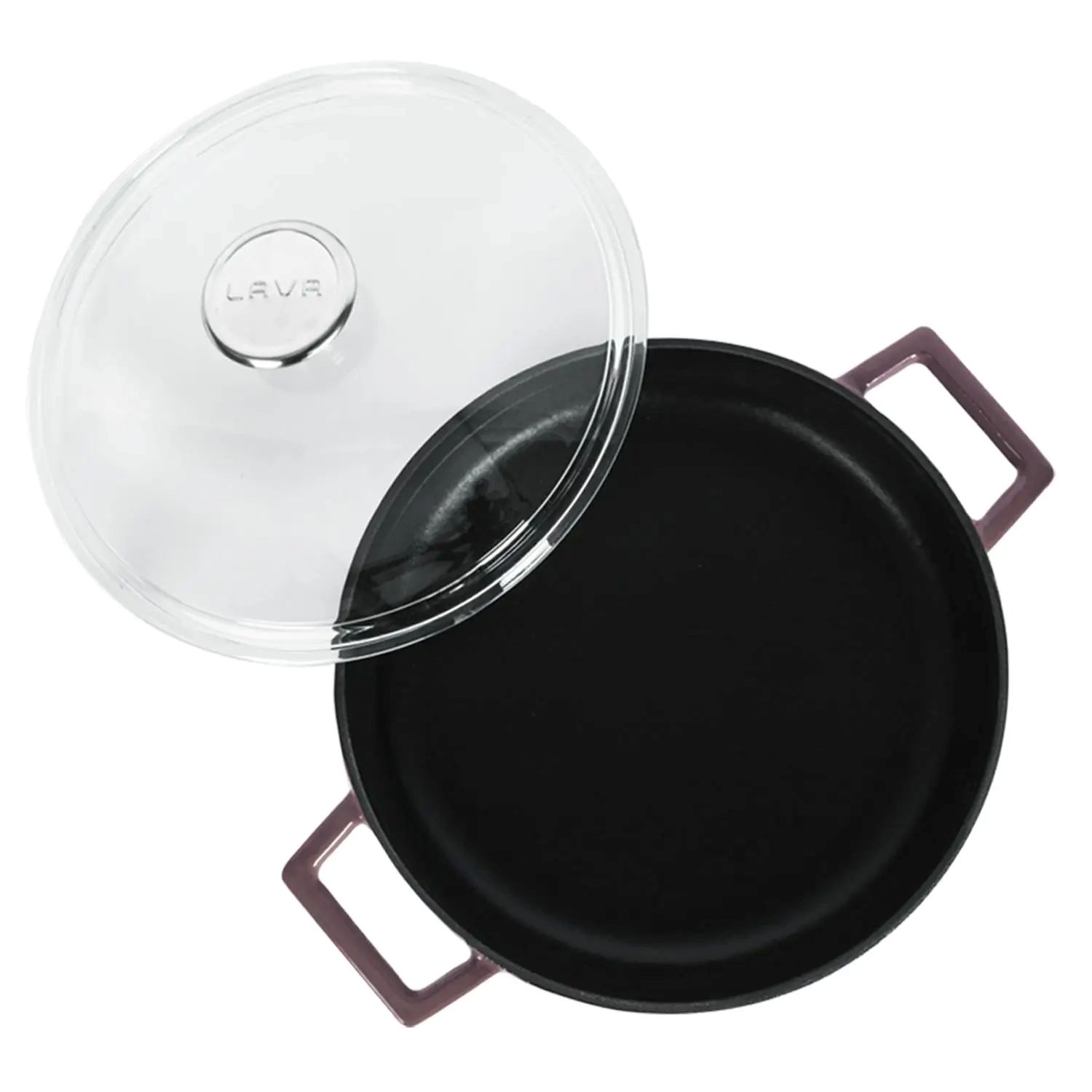 Тенджера с капак, изработена от термоустоително стъкло, произведено от Lava, диаметър 28 см, вместимост 3,5 л, направена от чугун.
