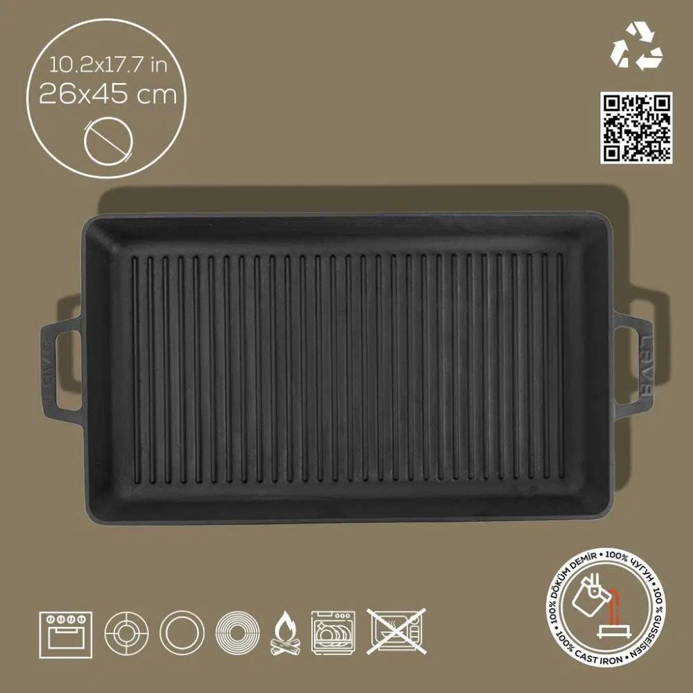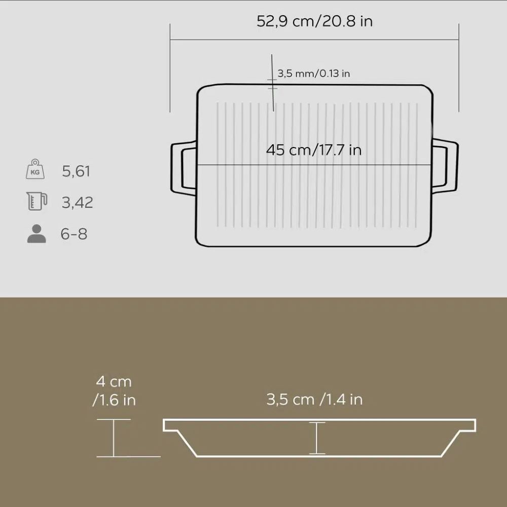 Grilovací podnos, značka Lava, vnitřní rozměr 45 x 26 cm, objem 3,42 l, vyrobeno z litiny.
