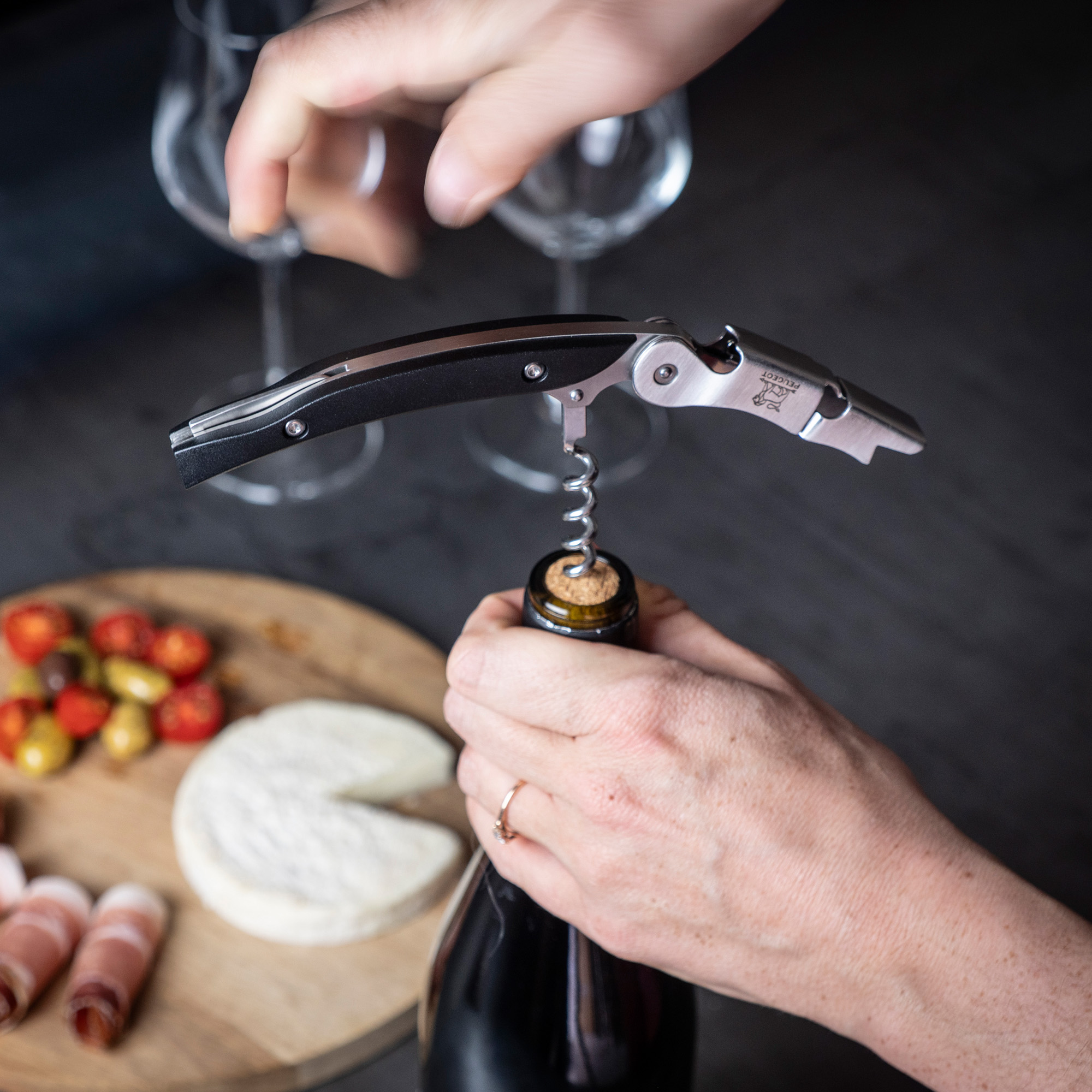 Ruční vývrtka Malbec s nerezovou spirálou a tělem z ABS snadno otevírá lahve vína a má také vestavěný řezač fólie a klíč pro otevírání víček lahví.