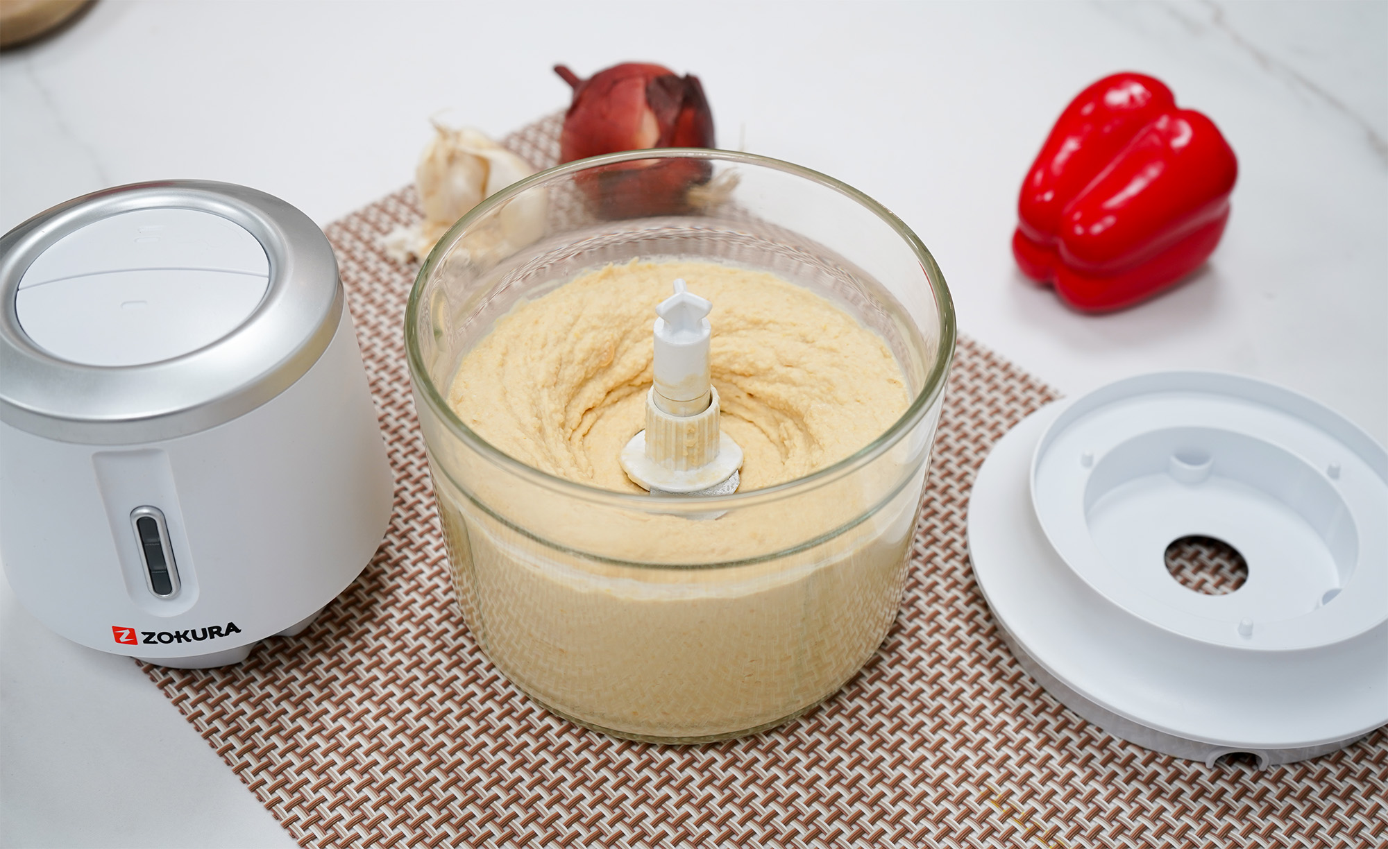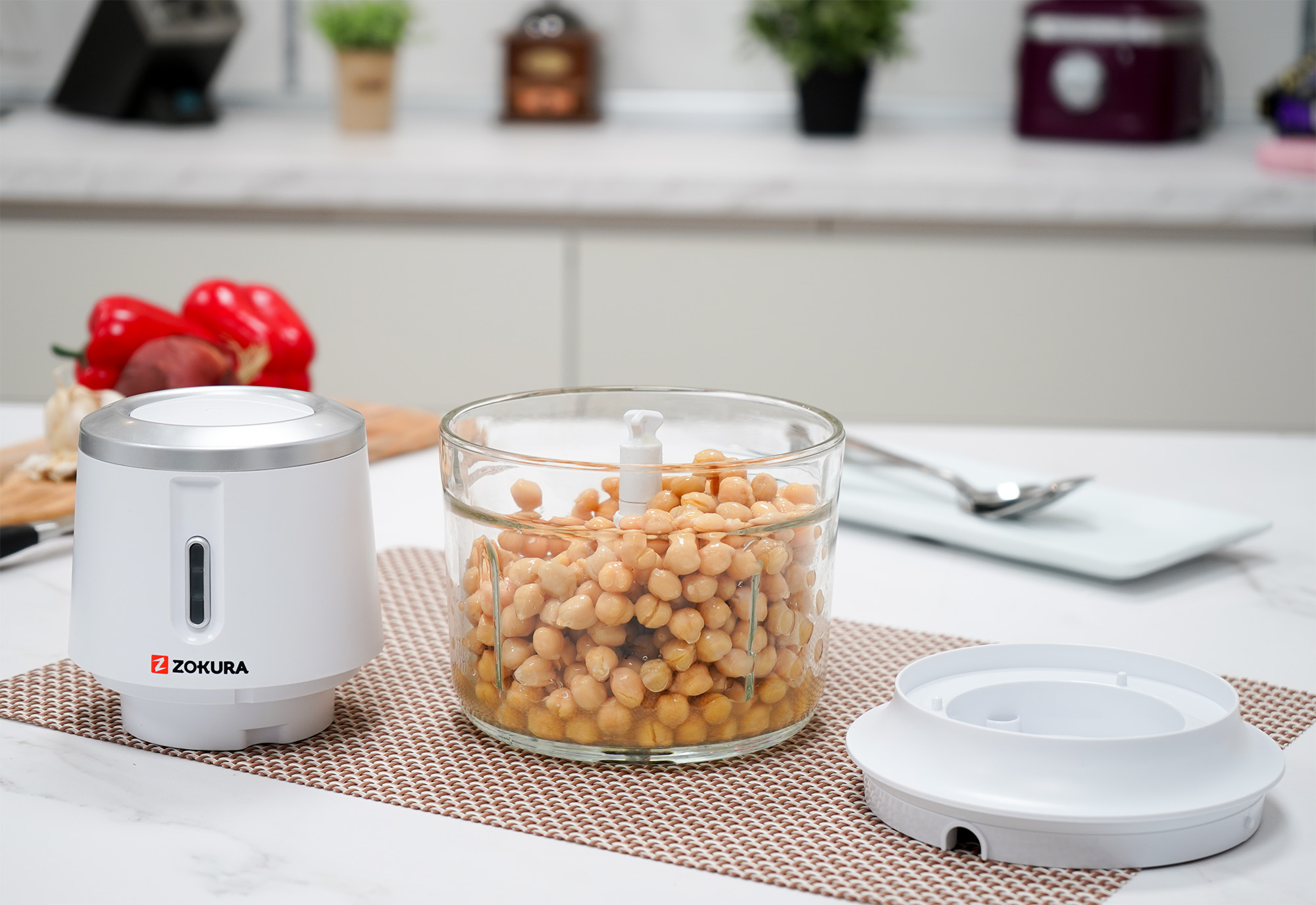 Den holdbare glasskål med en kapacitet på 1 l er BPA-fri og tåler opvaskemaskine. Knivene bør ikke rengøres i opvaskemaskinen, da de kan blive sløve.