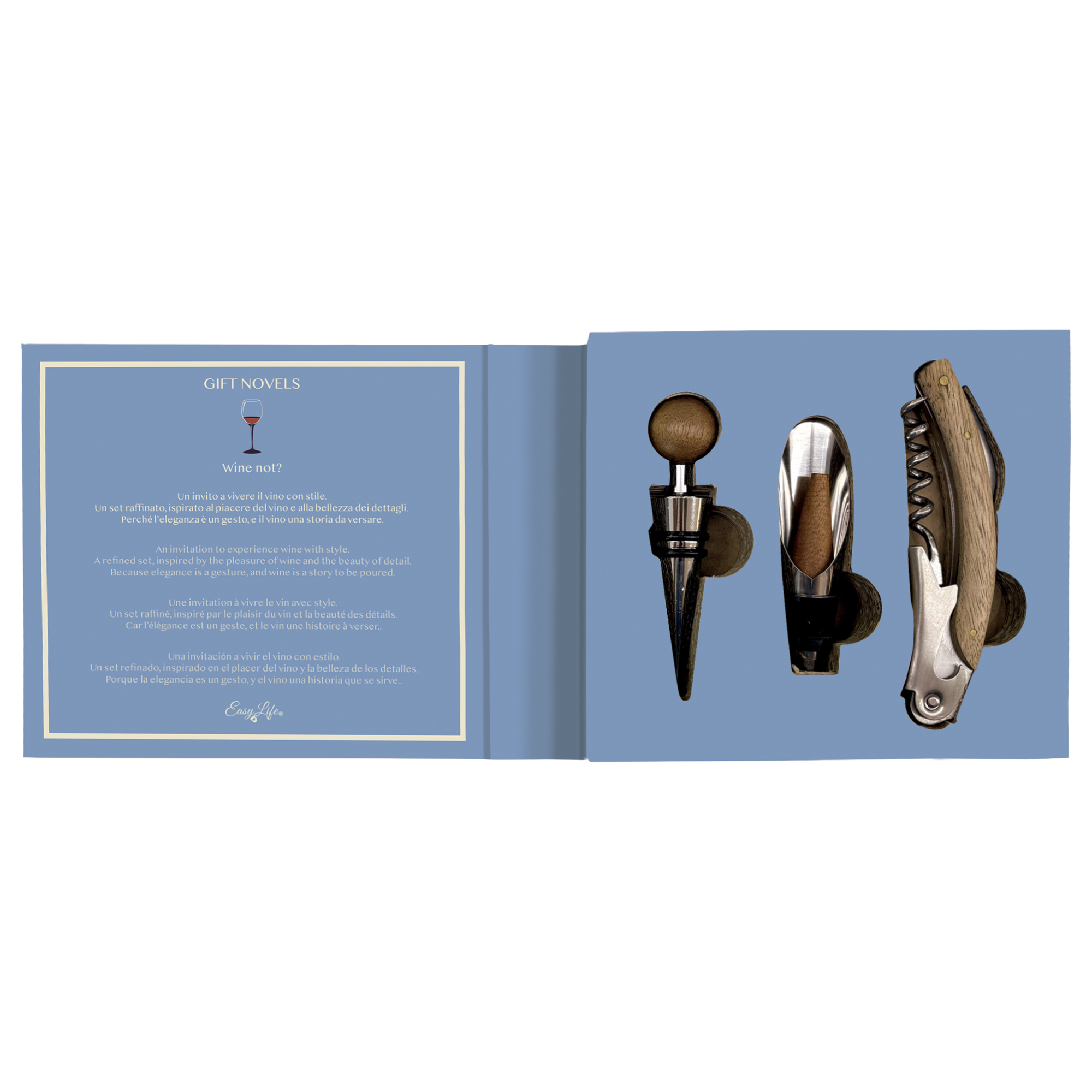 Um Ihre Lieblingsweine zu servieren, benötigen Sie immer das richtige Zubehör, und das Nuova R2S Geschenkset ist perfekt für Weinliebhaber, die ihre Weinflaschen einfach öffnen, einschenken und richtig aufbewahren möchten.