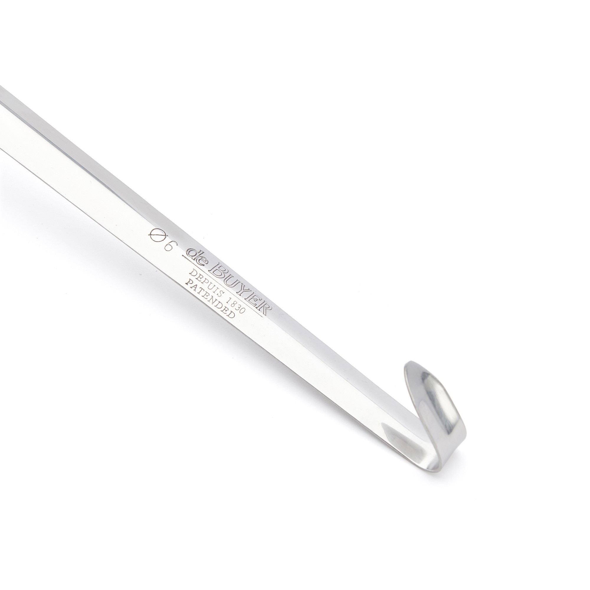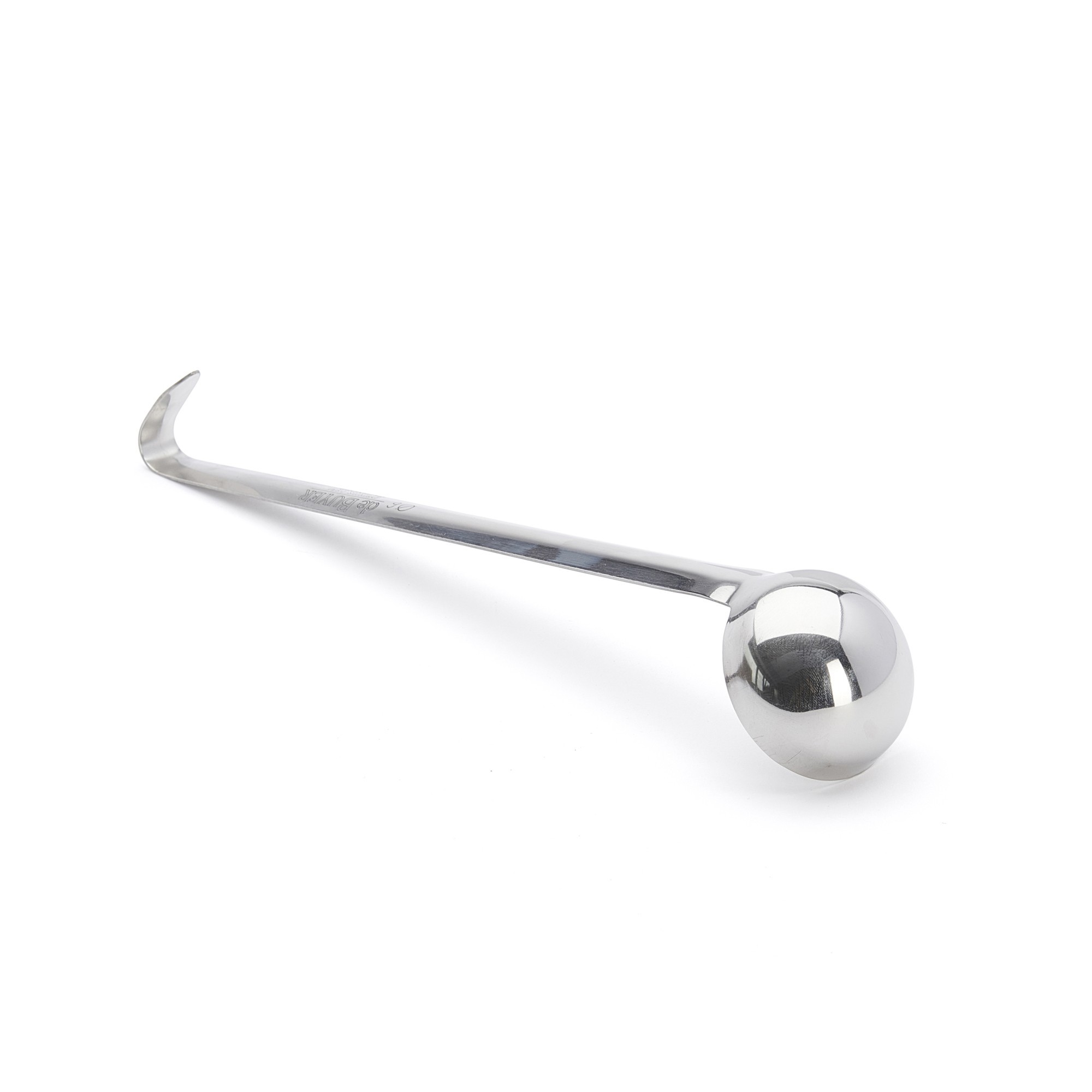 Schöpfkelle, Länge 32 cm (Grifflänge 28 cm), Höhe 3 cm, Schüsseldurchmesser 6 cm, Fassungsvermögen 0,05 l, Dicke 1,2 mm, aus Edelstahl, Marke de Buyer