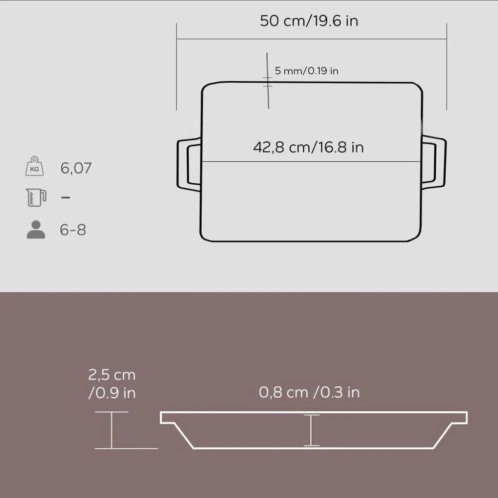 Το πάχος της εστίας είναι 5 mm στο εσωτερικό μέρος και 3,5 mm στην άκρη. Το προϊόν είναι επικαλυμμένο με ένα στρώμα μαύρου σμάλτου που διευκολύνει τον σχηματισμό μιας αντικολλητικής επιφάνειας κατά το μαγείρεμα με χρήση λίπους.