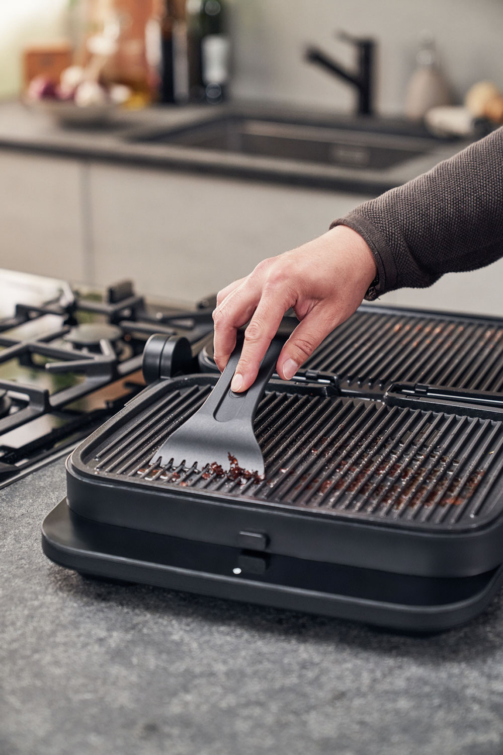 Η λειτουργία 2-σε-1 επιτρέπει τη χρήση του είτε κλειστού (σχάρα επαφής) είτε ανοιχτού σε γωνία 180°, σε λειτουργία εξαιρετικά μεγάλου BBQ.