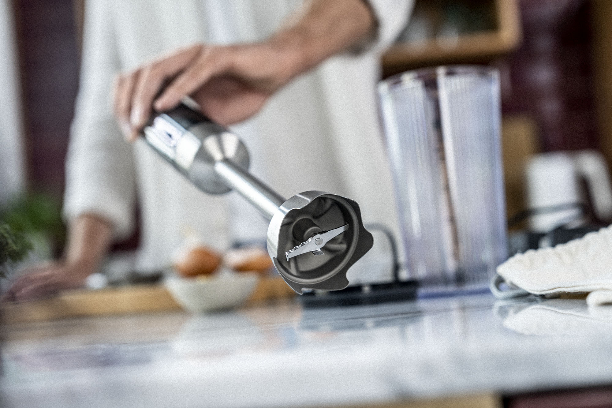 Η εργονομική λαβή και το ειδικά διαμορφωμένο κουδούνι ανάμειξης βελτιώνουν το χειρισμό και βελτιώνουν την απόδοση επεξεργασίας τροφίμων. Λειτουργεί τέλεια στο ποτήρι ζέσεως που περιλαμβάνεται, καθώς και σε άλλα ψηλά δοχεία.