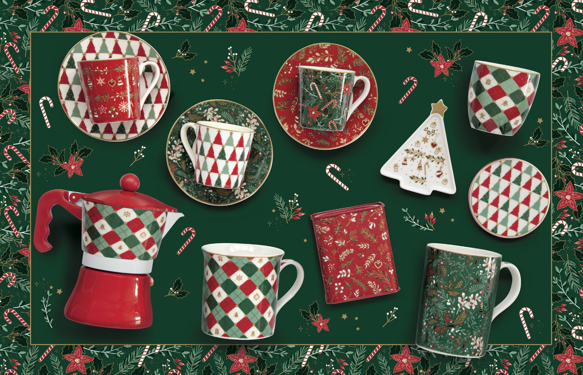 The "Fancy Christmas" collection, featuring geometric motifs, includes beautifully decorated items in the traditional colors of Christmas.