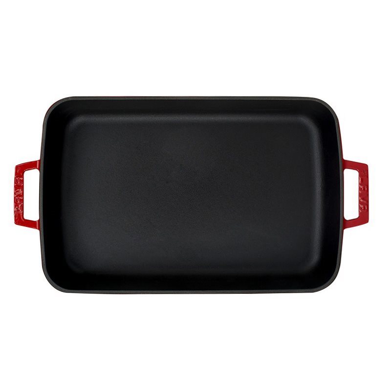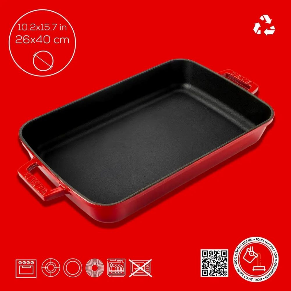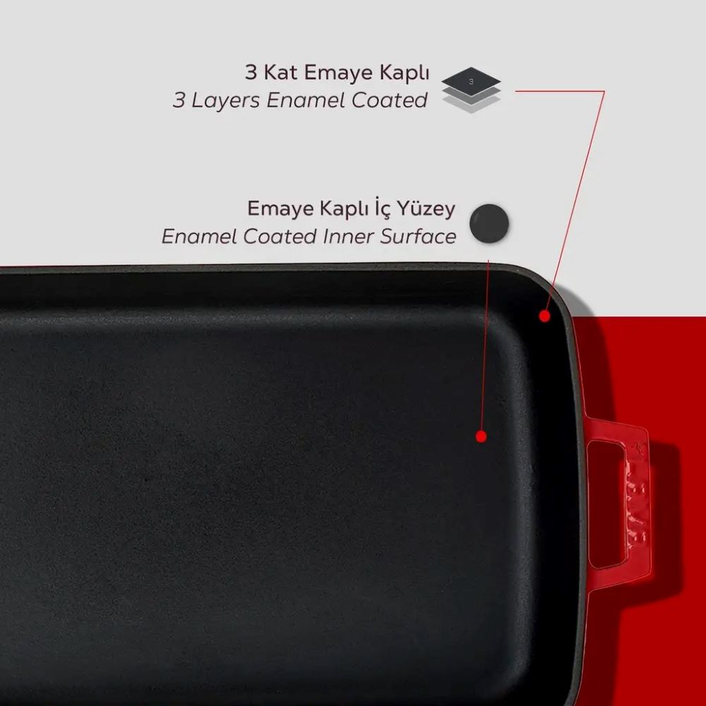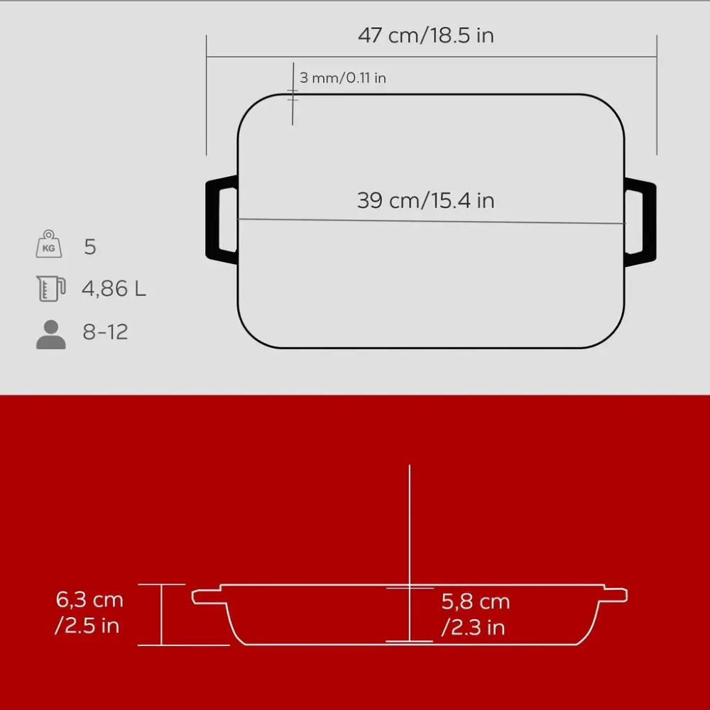 With a capacity of 4.86 l, the oven tray is coated with 3 thick layers of enamel on the outside and one matte black finish on the inside. Base thickness is 5 mm, while thickness of tray walls is 3 mm. The tray was subjected to the burning process 2 times for enhanced durability and better cooking performance.