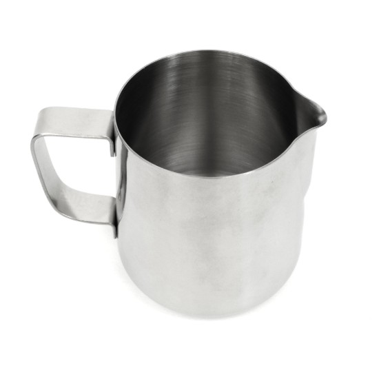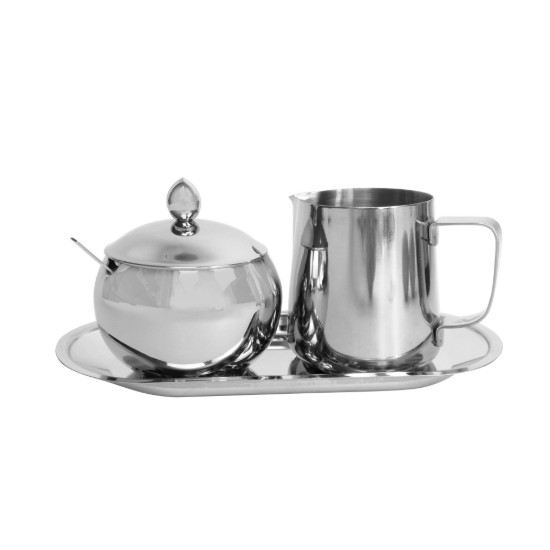 The set consists in a bowl for sugar with lid, a teaspoon, a mug for frothing milk with diameter base 8 cm and capacity 300 ml and a serving tray, sized 23 × 10 cm.