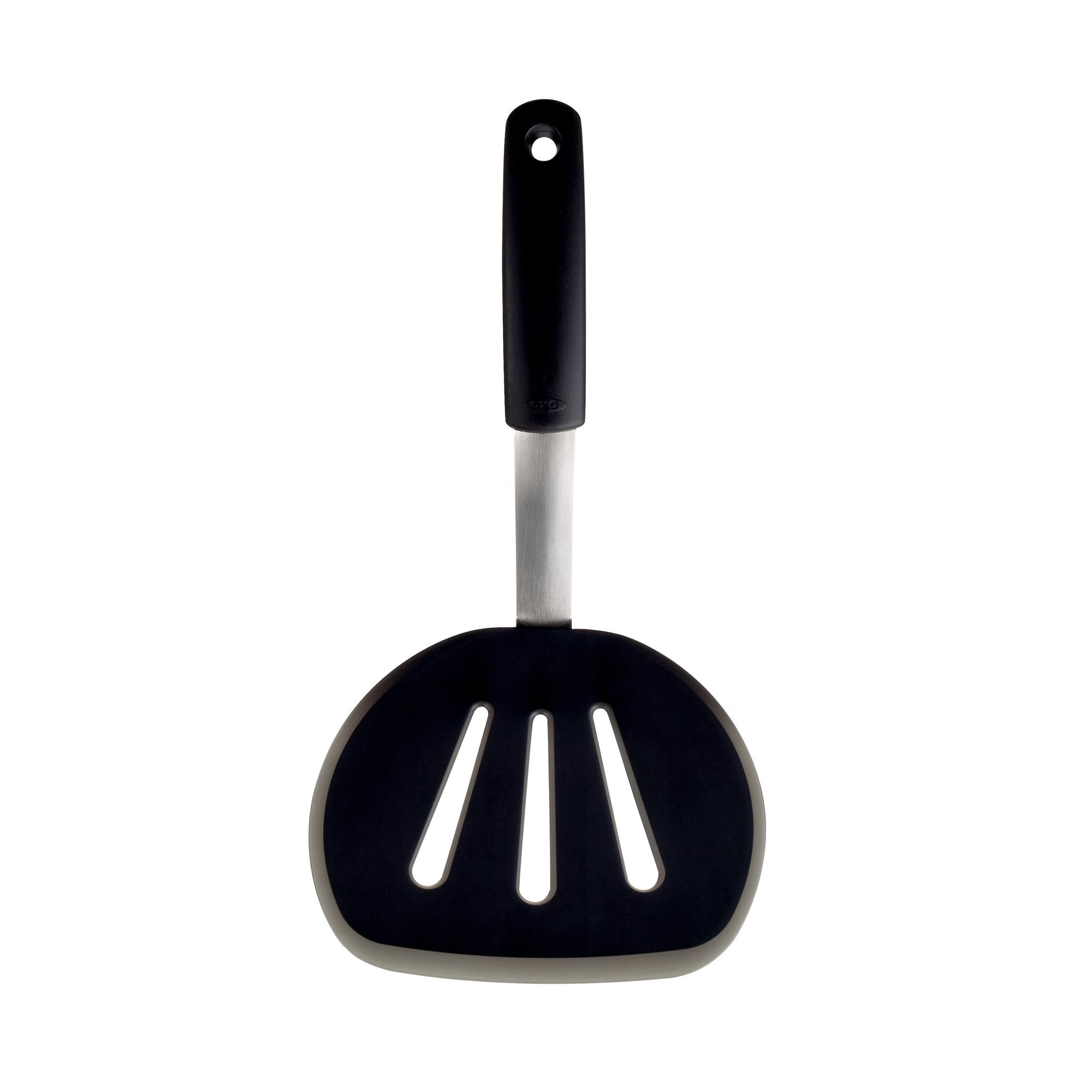 Slotted spatula for cooking, OXO brand, manufactured of high temperature resistant silicone.