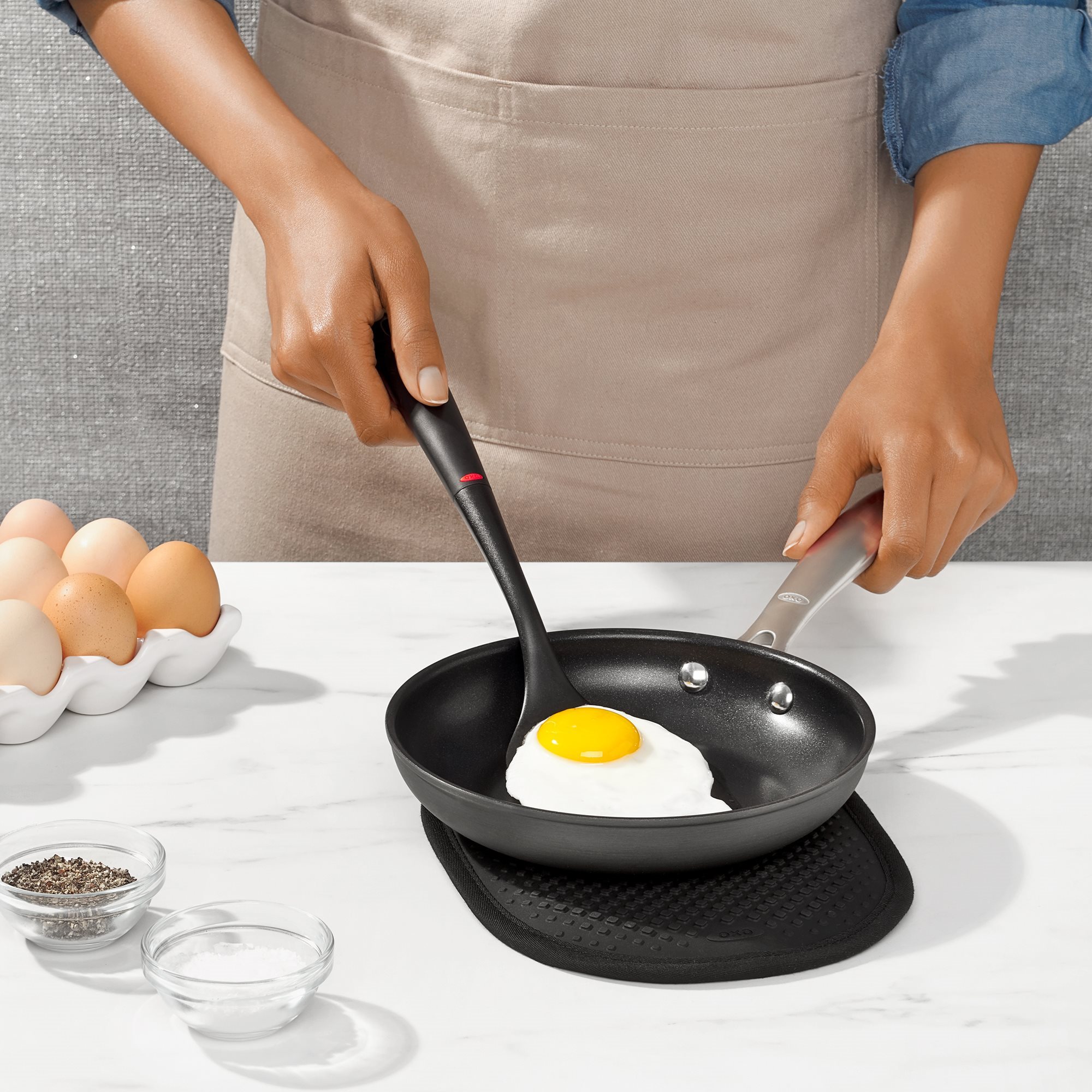 OXO brand nylon products benefit from a high quality, being provided with oversized ends and comfortable handles. The ends withstand high temperatures and are suitable for cookware with non-stick surface.