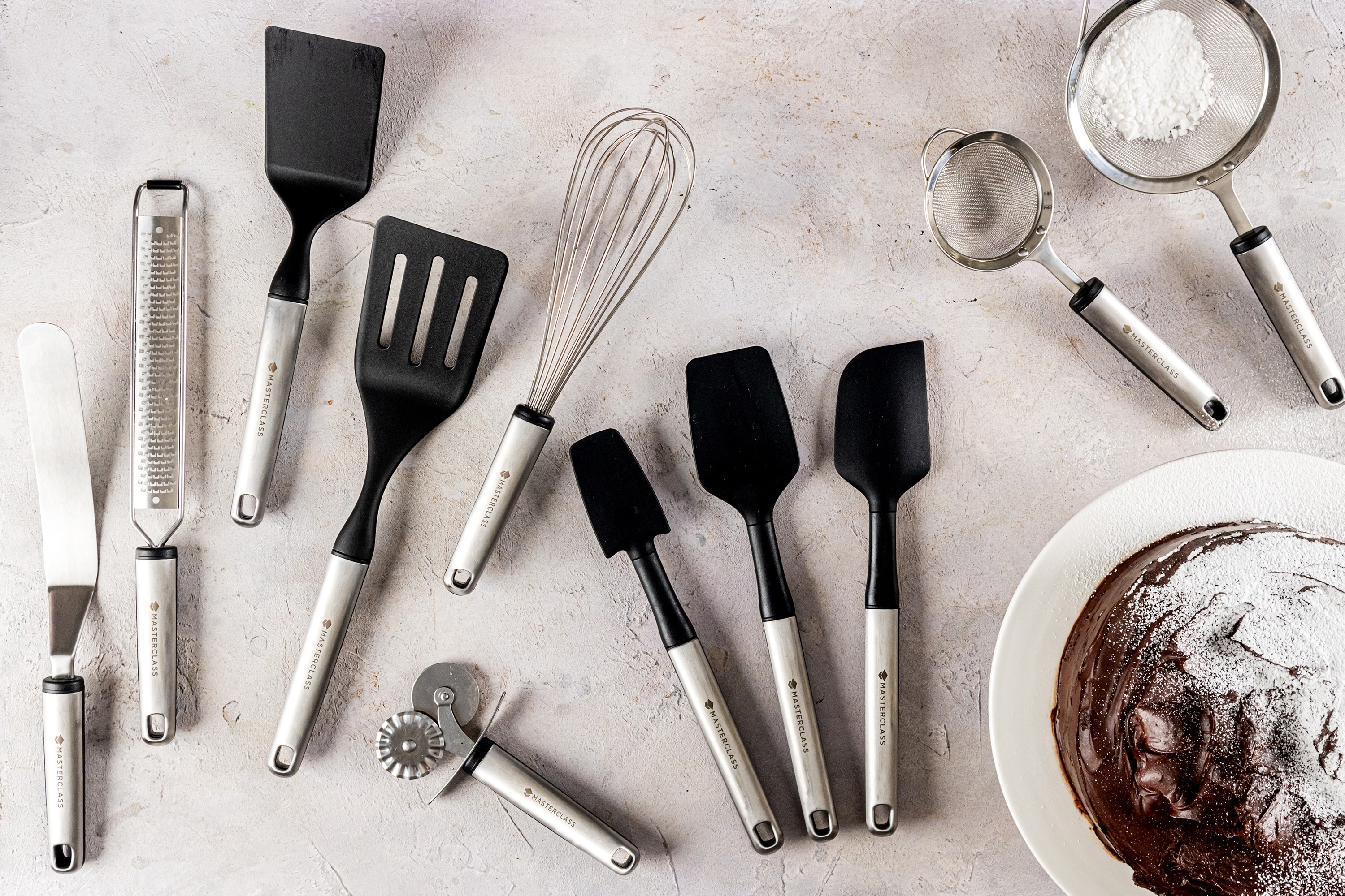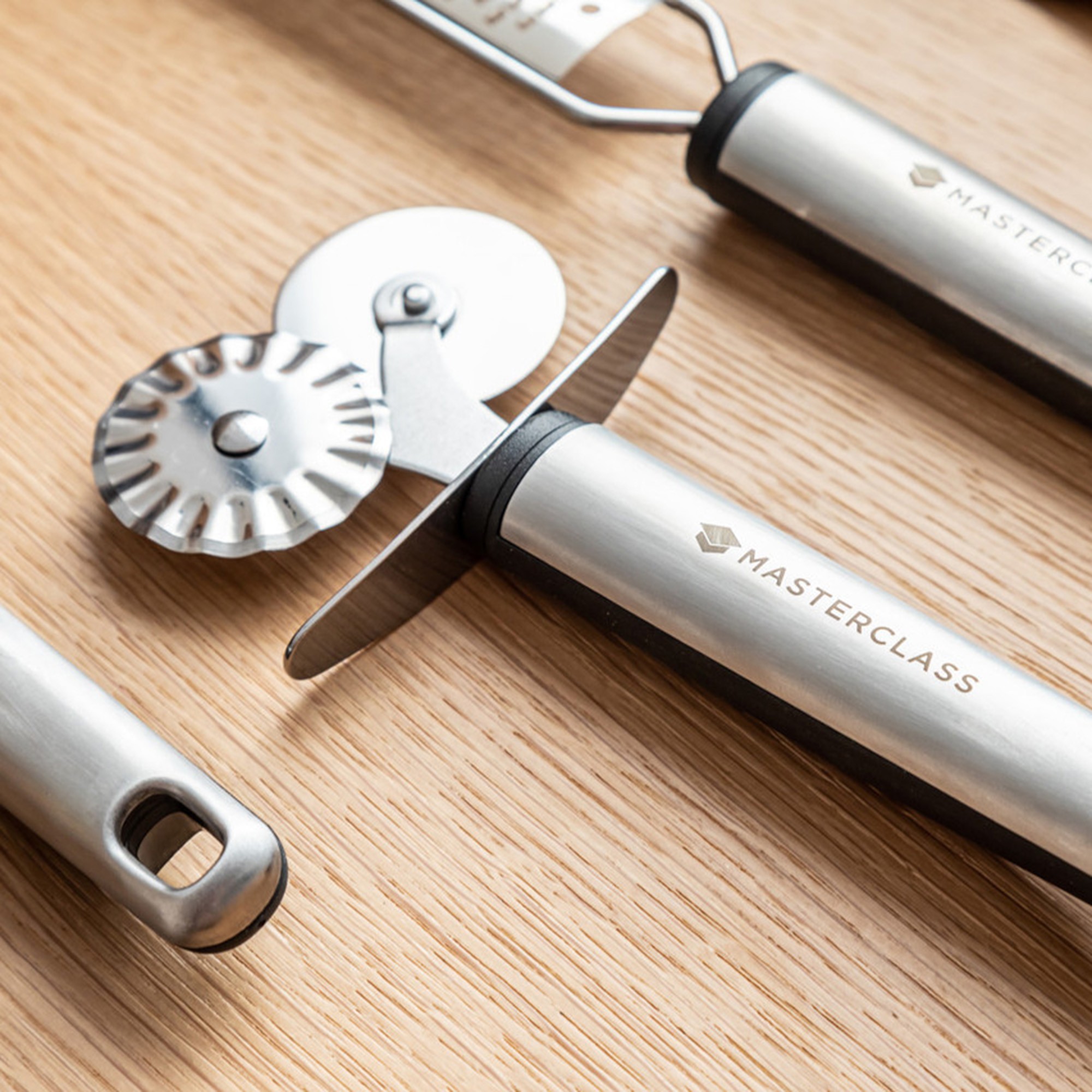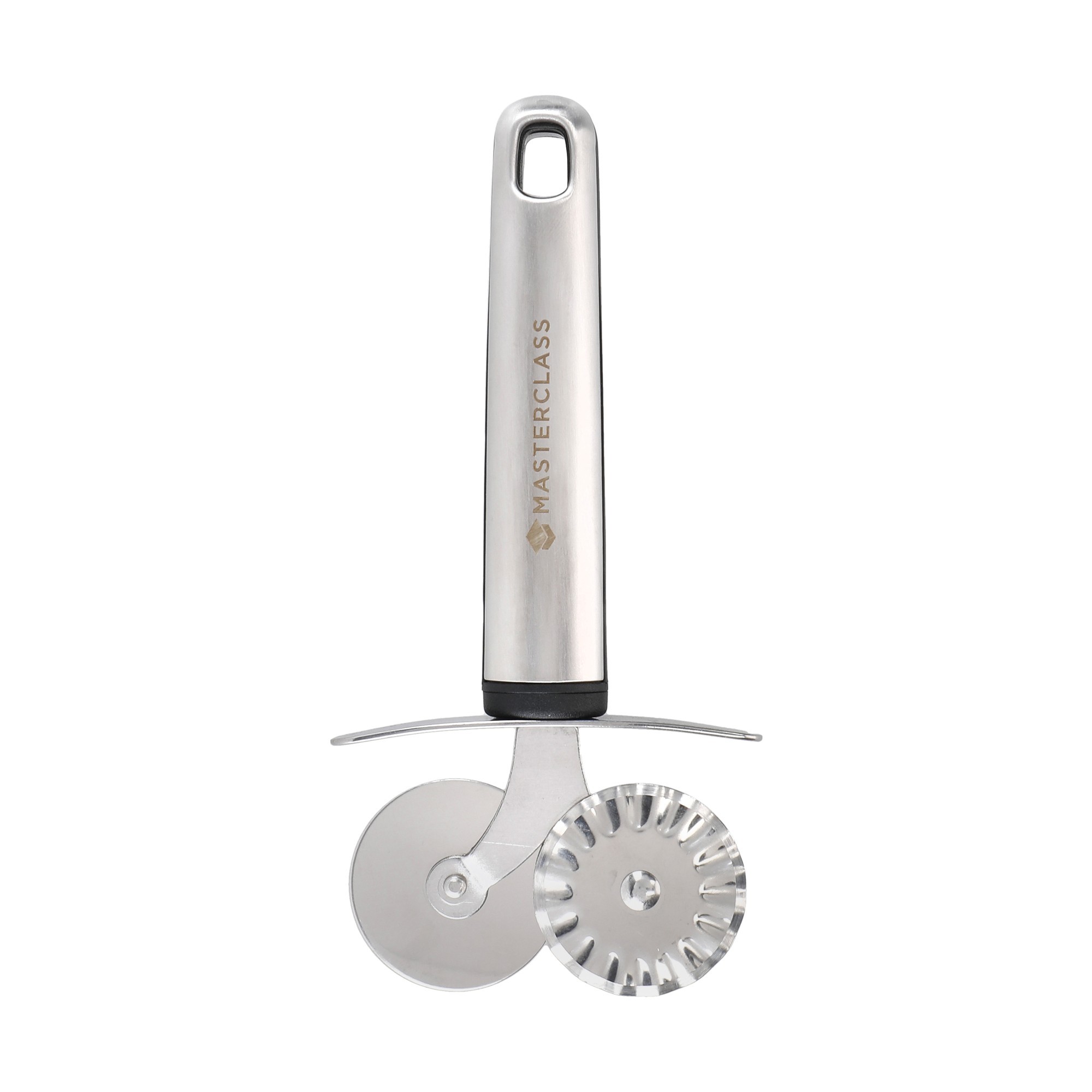 Double-wheeled pastry cutter, made of stainless steel, produced by MasterClass.
