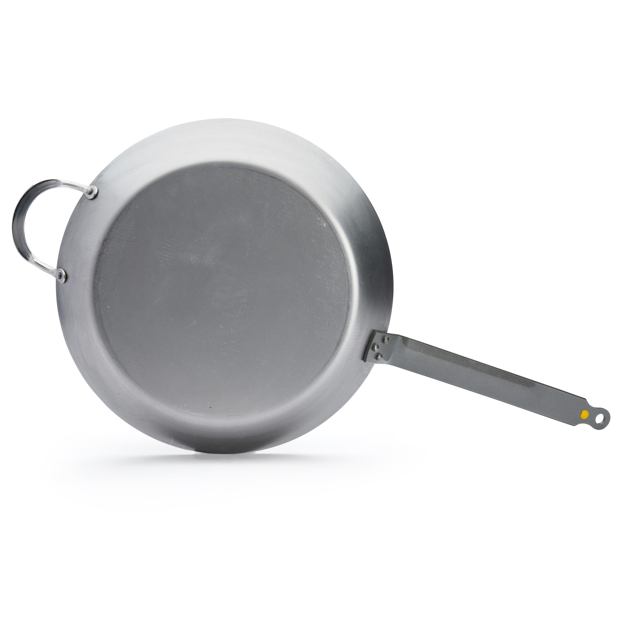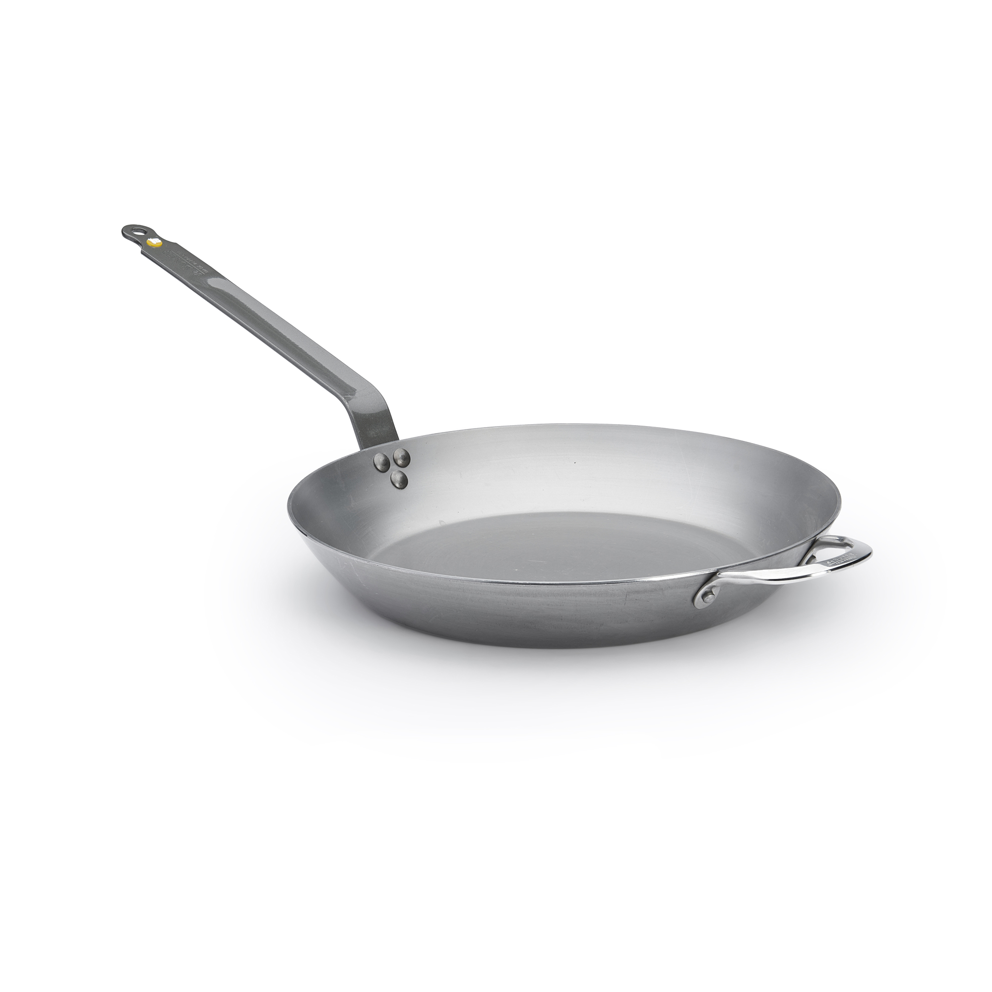 Professional-quality frying pan - de Buyer brand - diameter 36 cm, height 5 cm, made from 3 mm thick steel that does not deform.