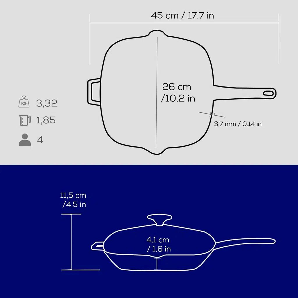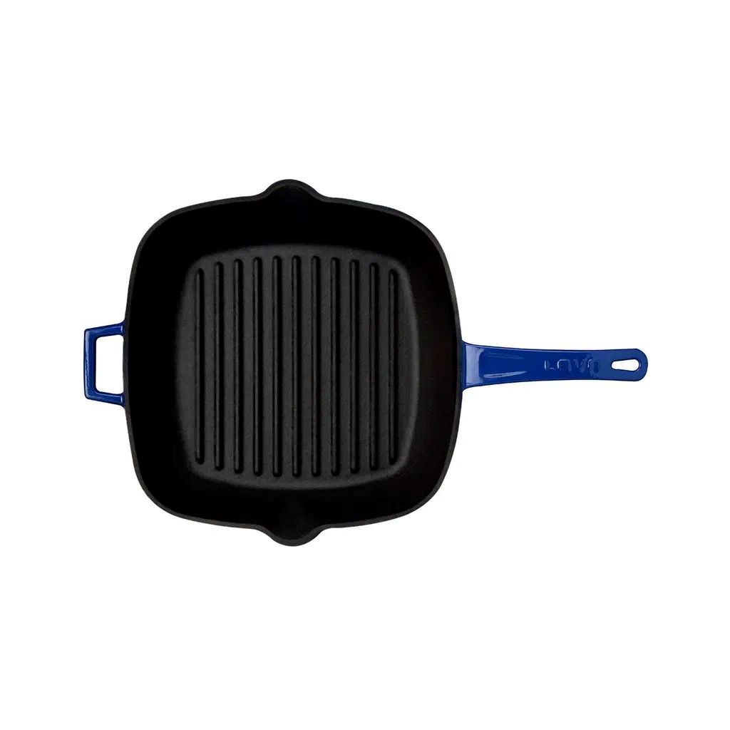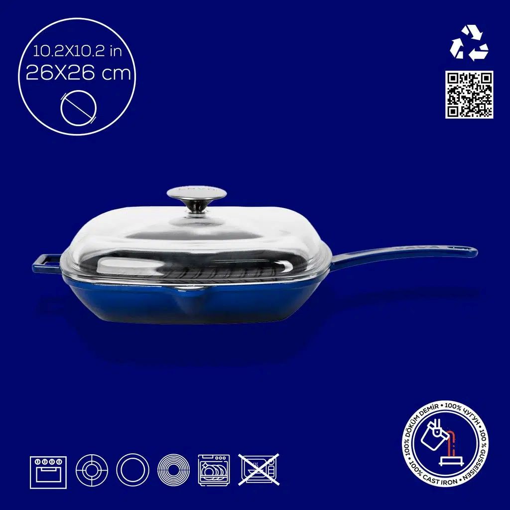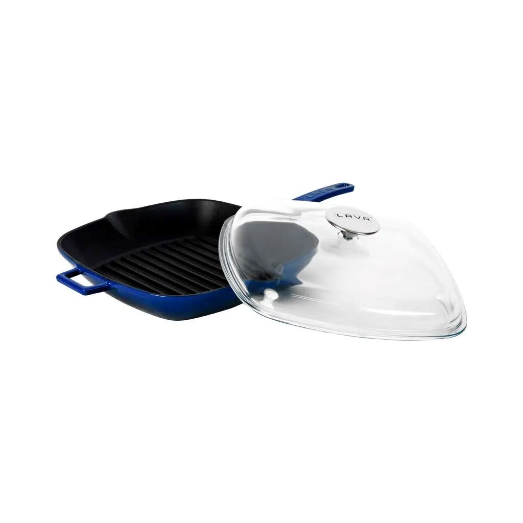 Squared grill pan, Lava brand, dimensions of 26 x 26 cm, made from cast iron. The grill pan is provided with a lid made of heat resisting glass.