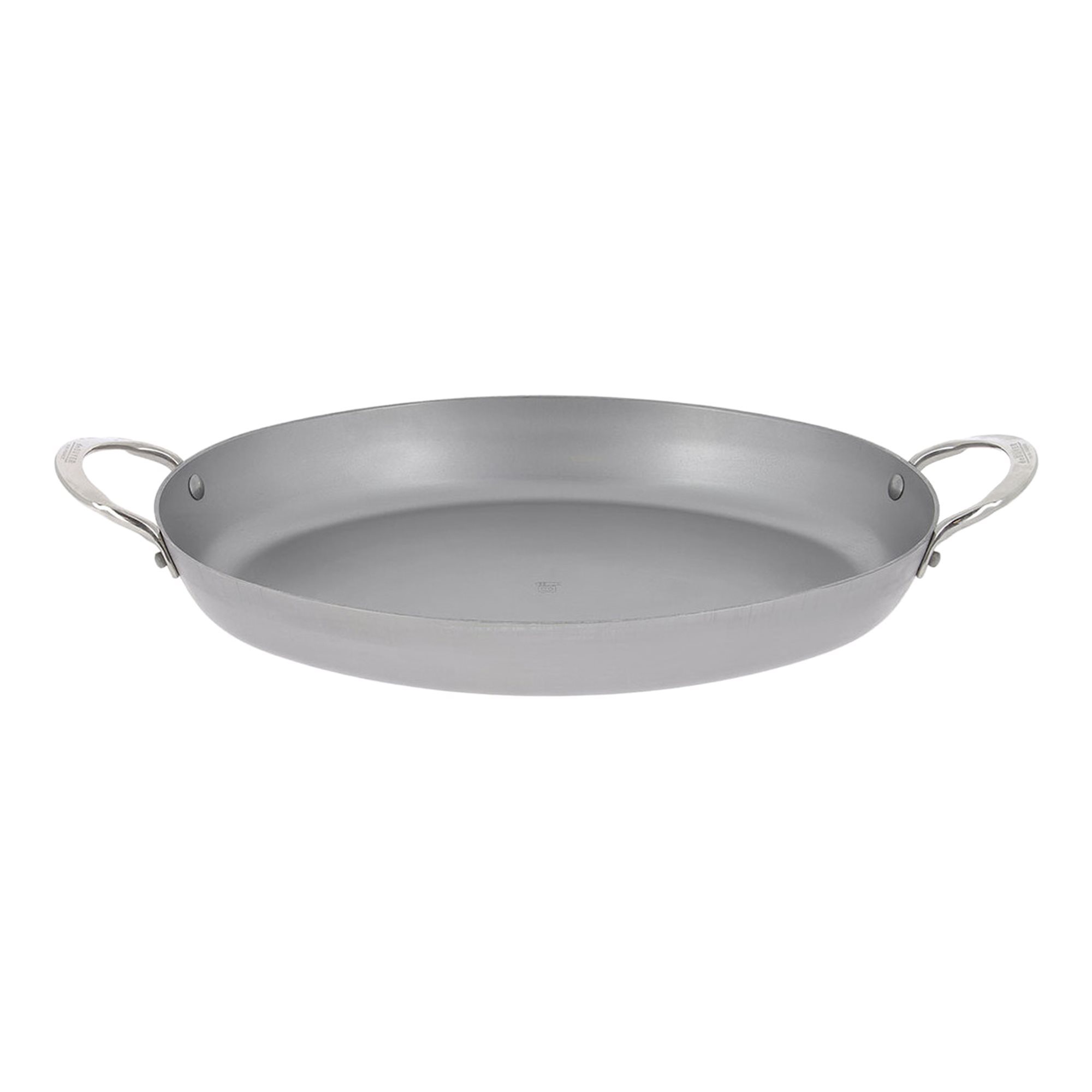 Oval-shaped "Mineral B" frying pan with 2 handles, dimensions 36 x 24 cm, made of steel, de Buyer brand.