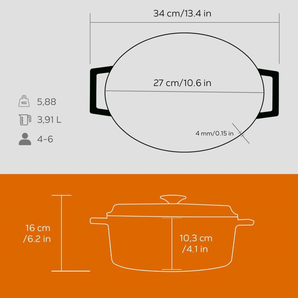 Oval saucepan, diameter 27 cm, capacity 3.9 L, made of cast iron, LAVA brand