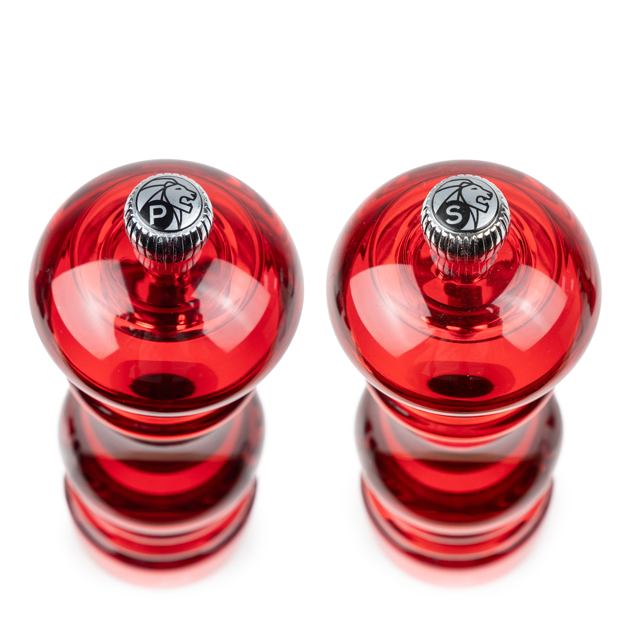 The intensity of the red and the transparency of the acrylic in this unique set of two salt and pepper mills will stand out every time, when dining. The box also includes a filling funnel for spices.
