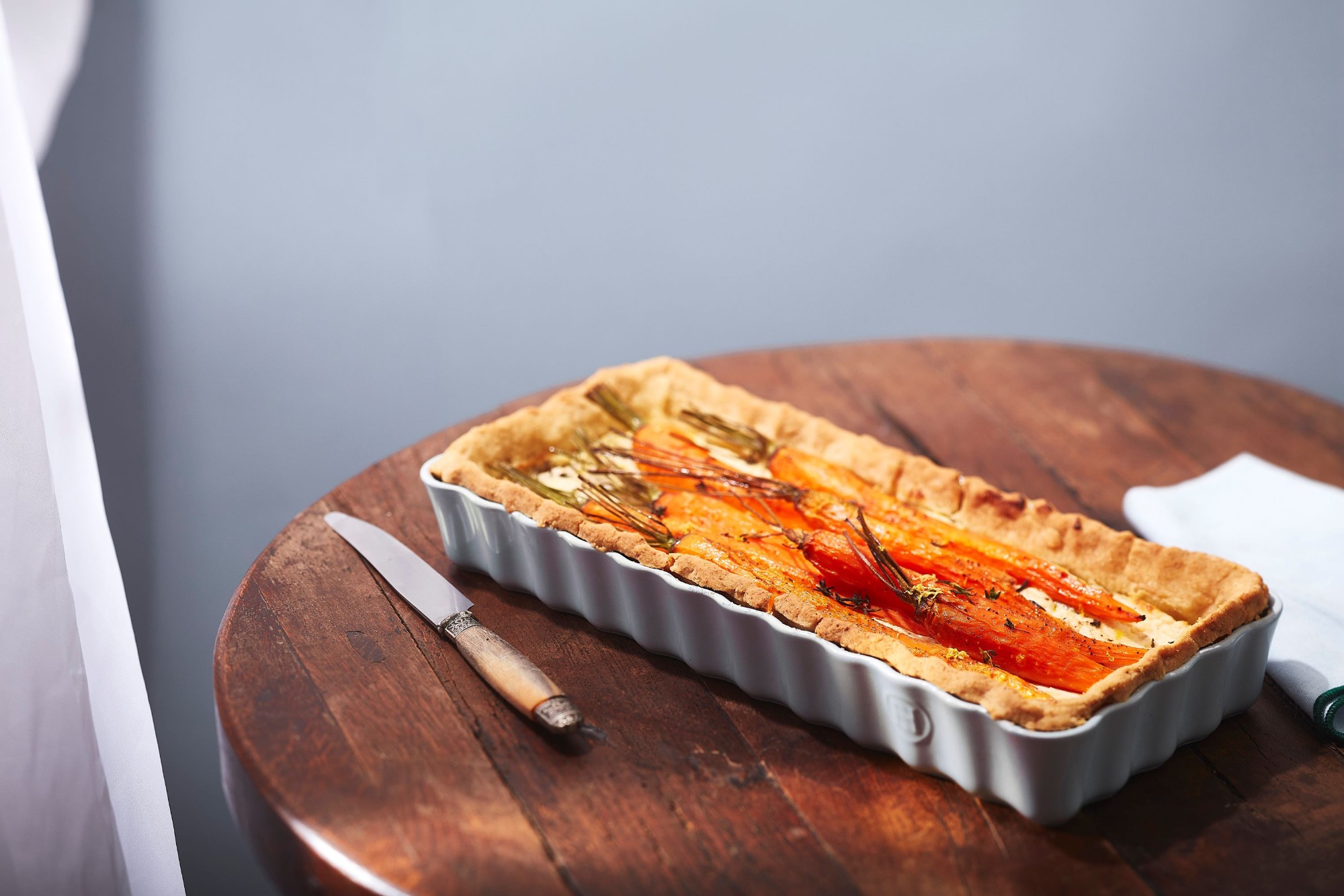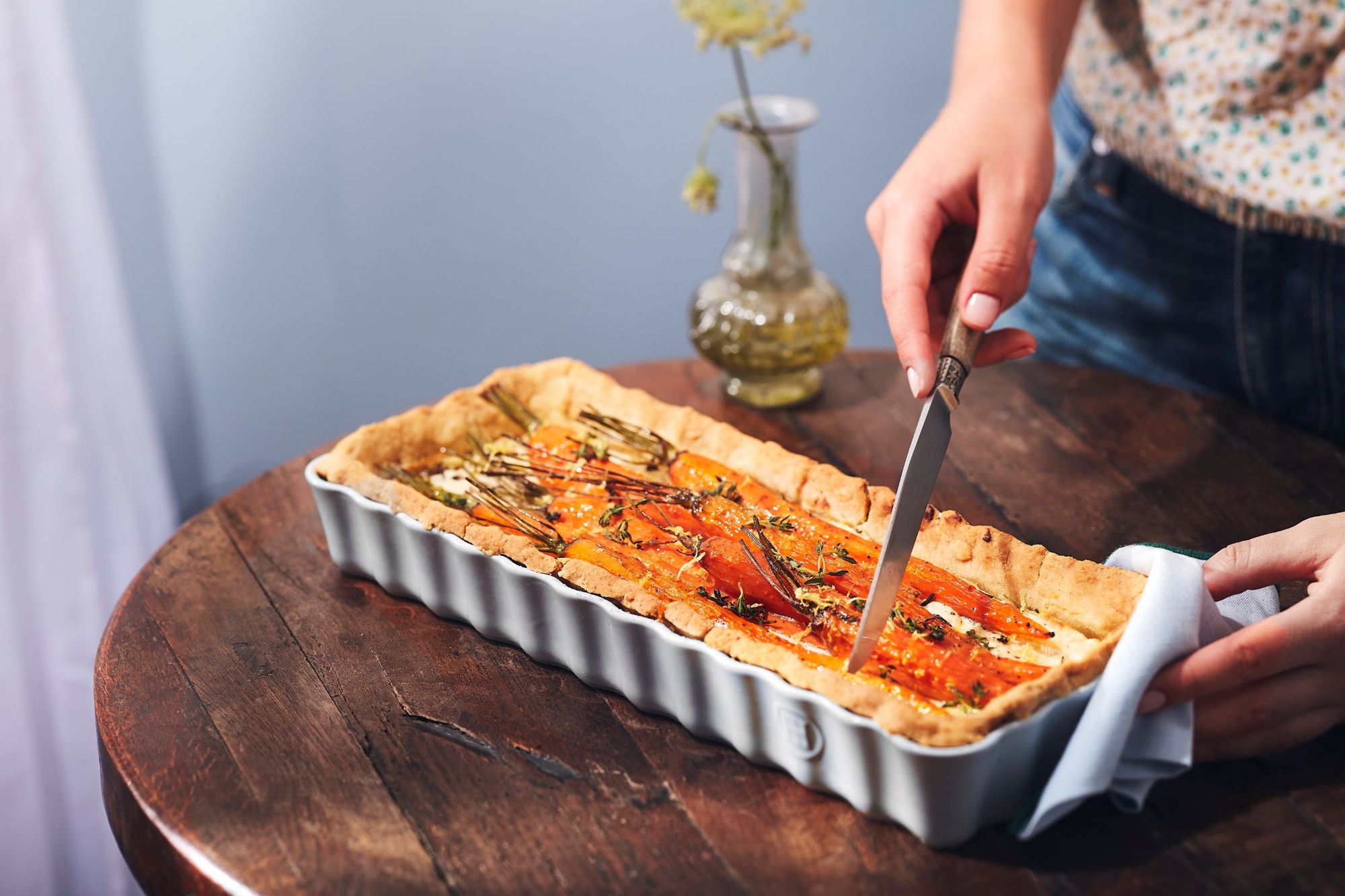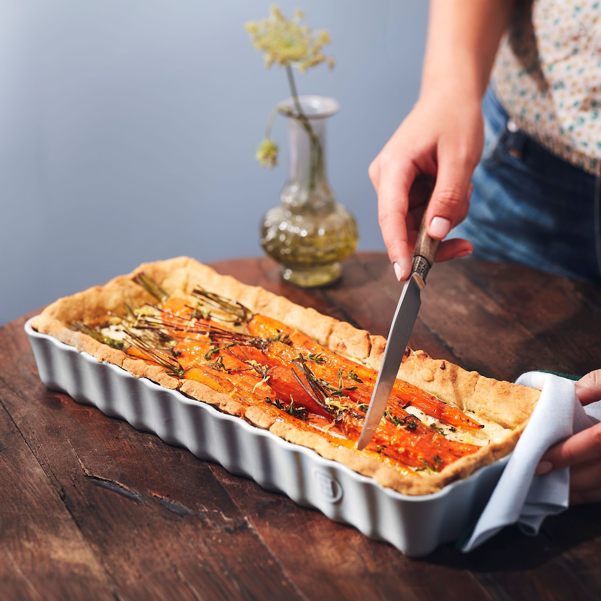 Rectangular tray, produced by Emile Henry, made from HR ceramic, ideal for preparing and serving tarts and pies.