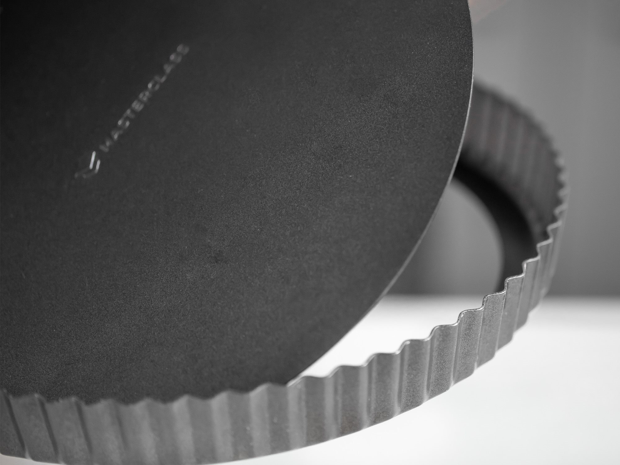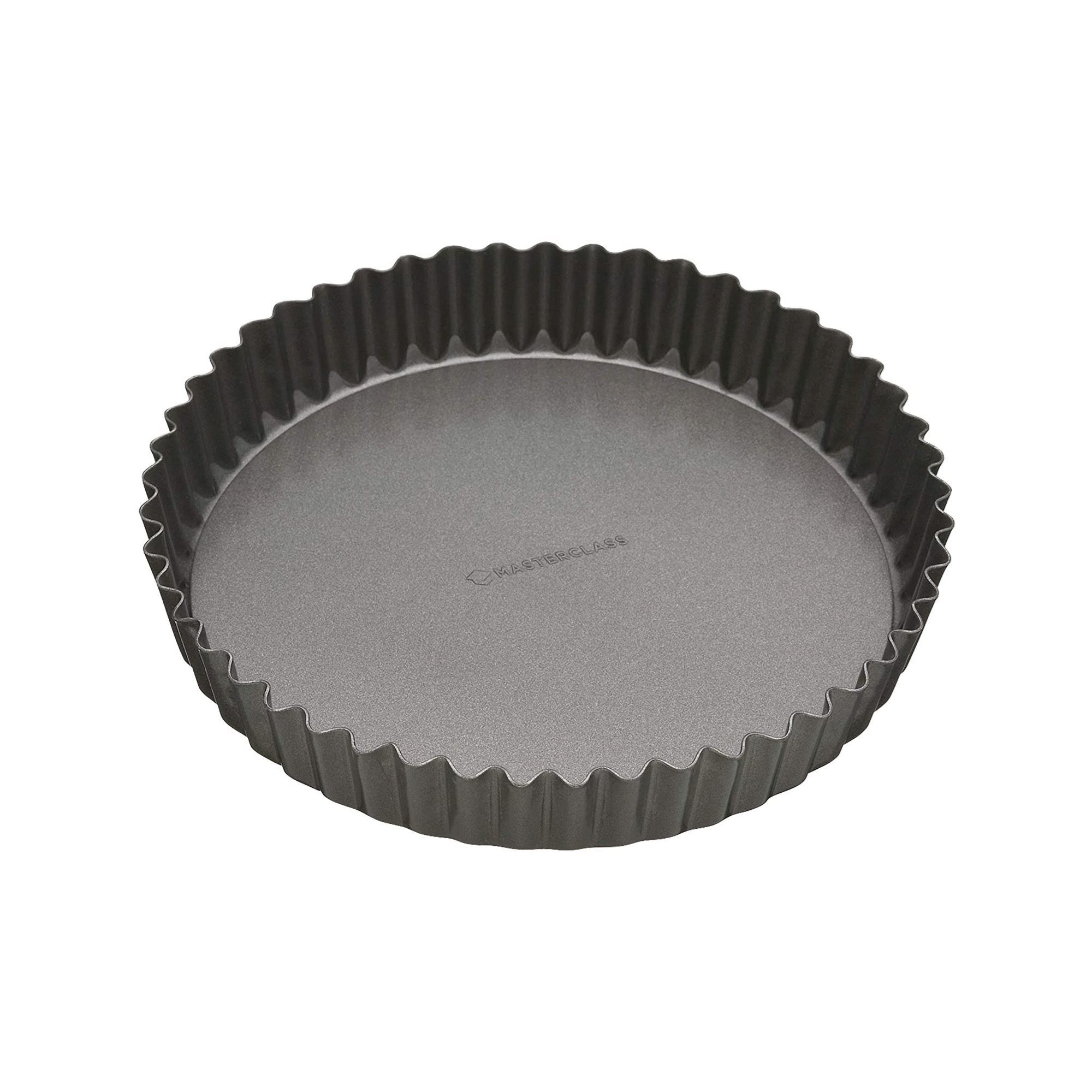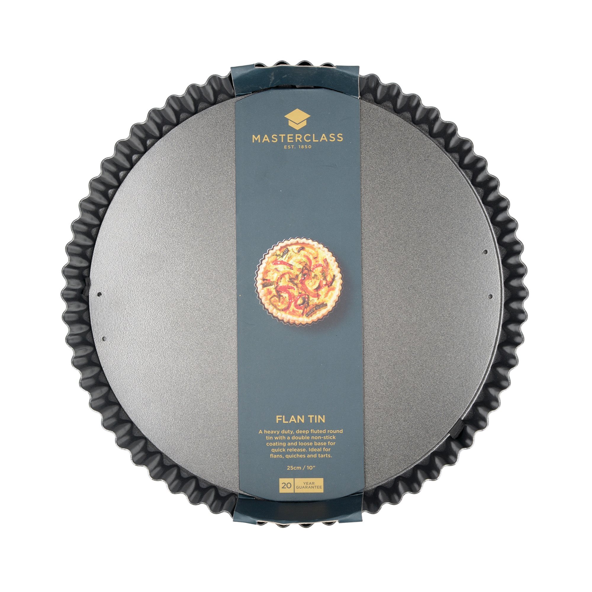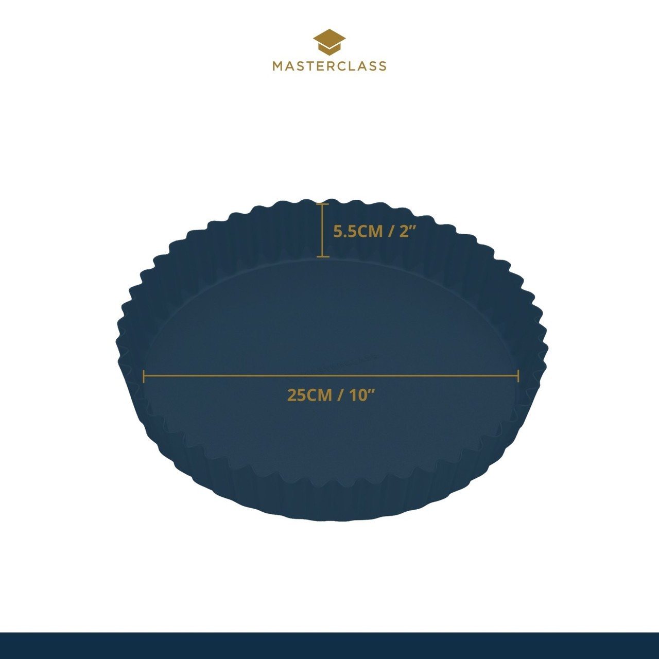 Mould for flan and quiche tart, produced by Kitchen Craft, manufactured from carbon steel 1 mm thick, 25 cm in diameter, 5.5 cm high, with double non-stick coating and removable base.