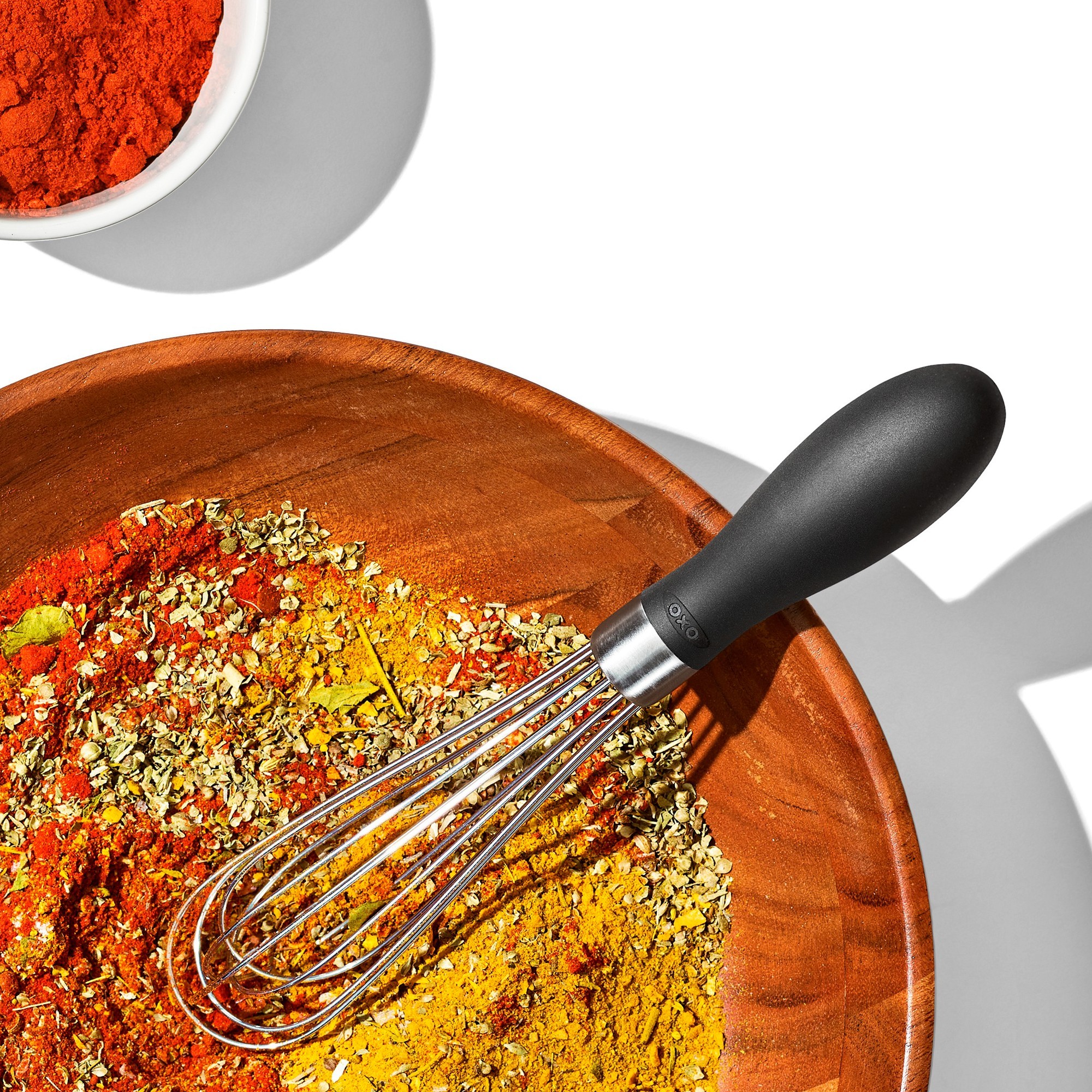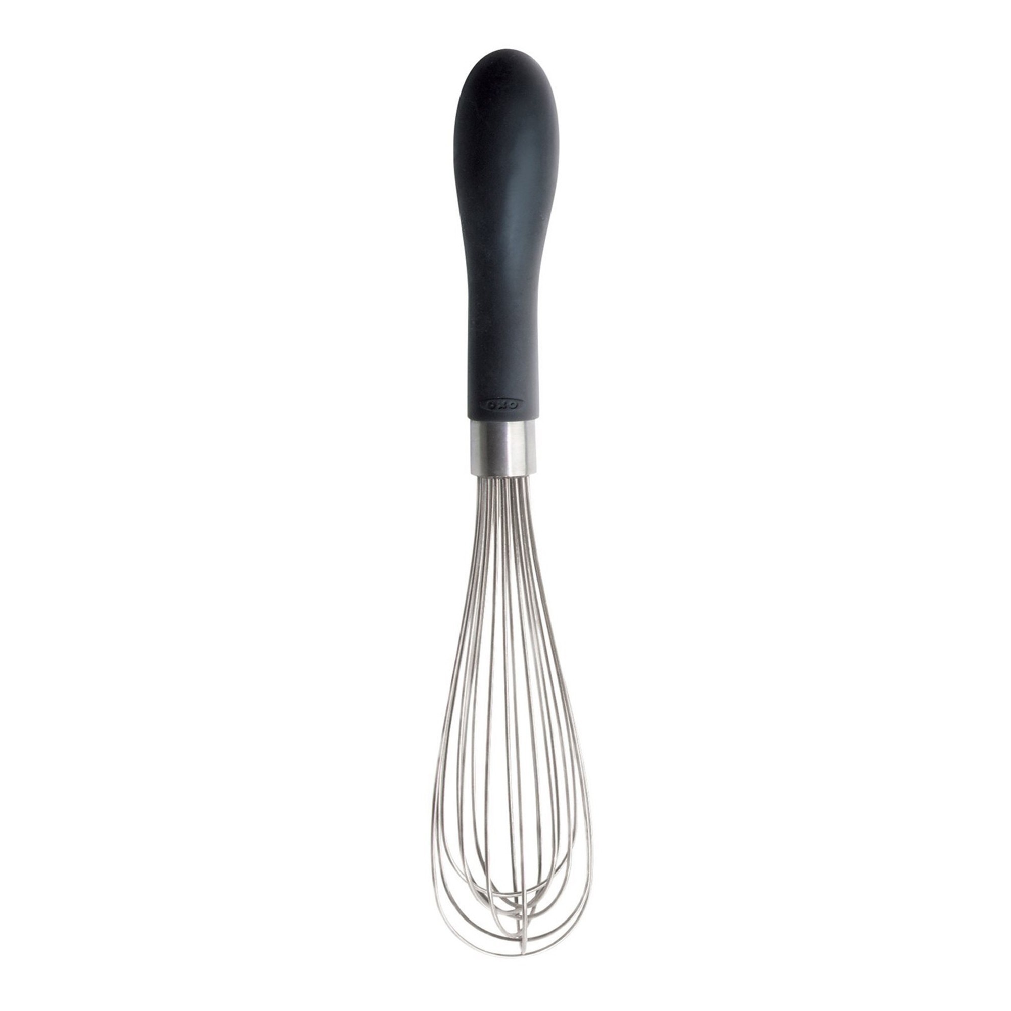 Whisk, made of stainless steel and provided with ergonomic handle, OXO brand.