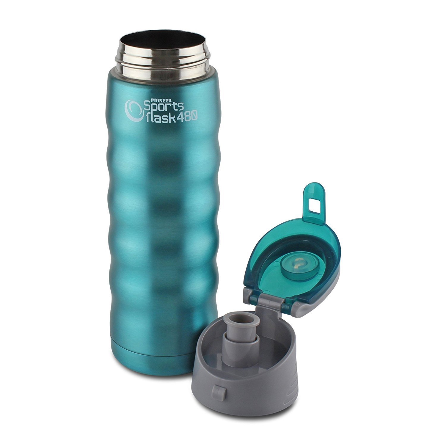 Botella térmicamente aislante, marca Grunwerg, fabricada en acero inoxidable, capacidad de 480 ml, color azul metalizado.