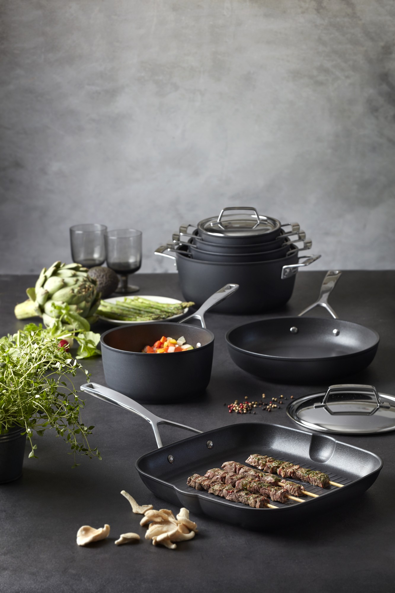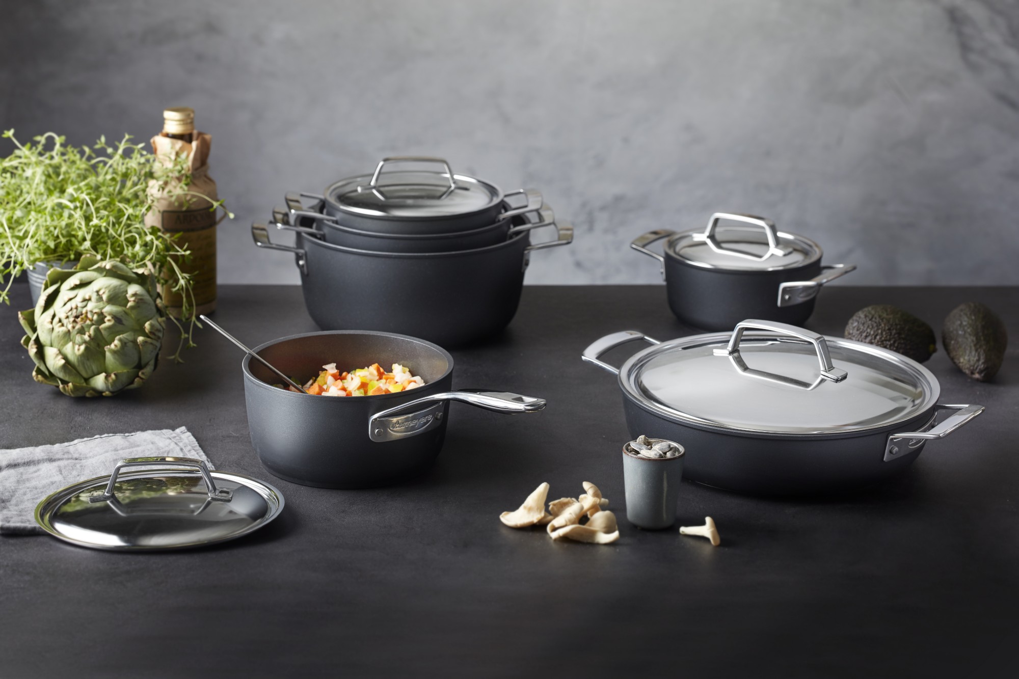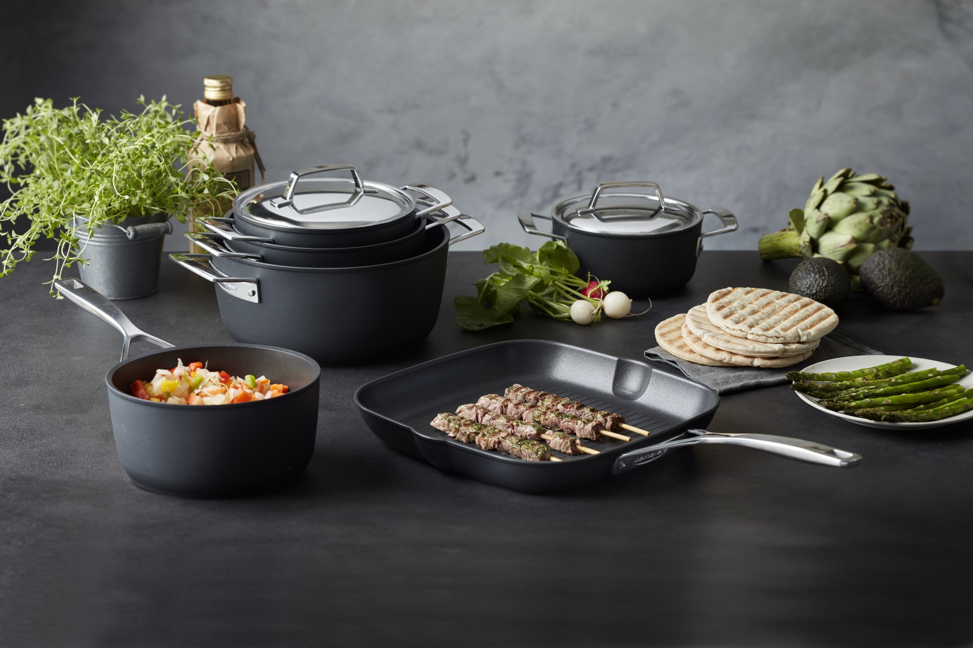 Los mangos ergonómicos de acero inoxidable son cómodos de agarrar y están remachados al cuerpo para mayor durabilidad. El revestimiento antiadherente Ti-X es apto para lavavajillas para una liberación rápida y fácil limpieza y es apto para horno hasta 500 °F.