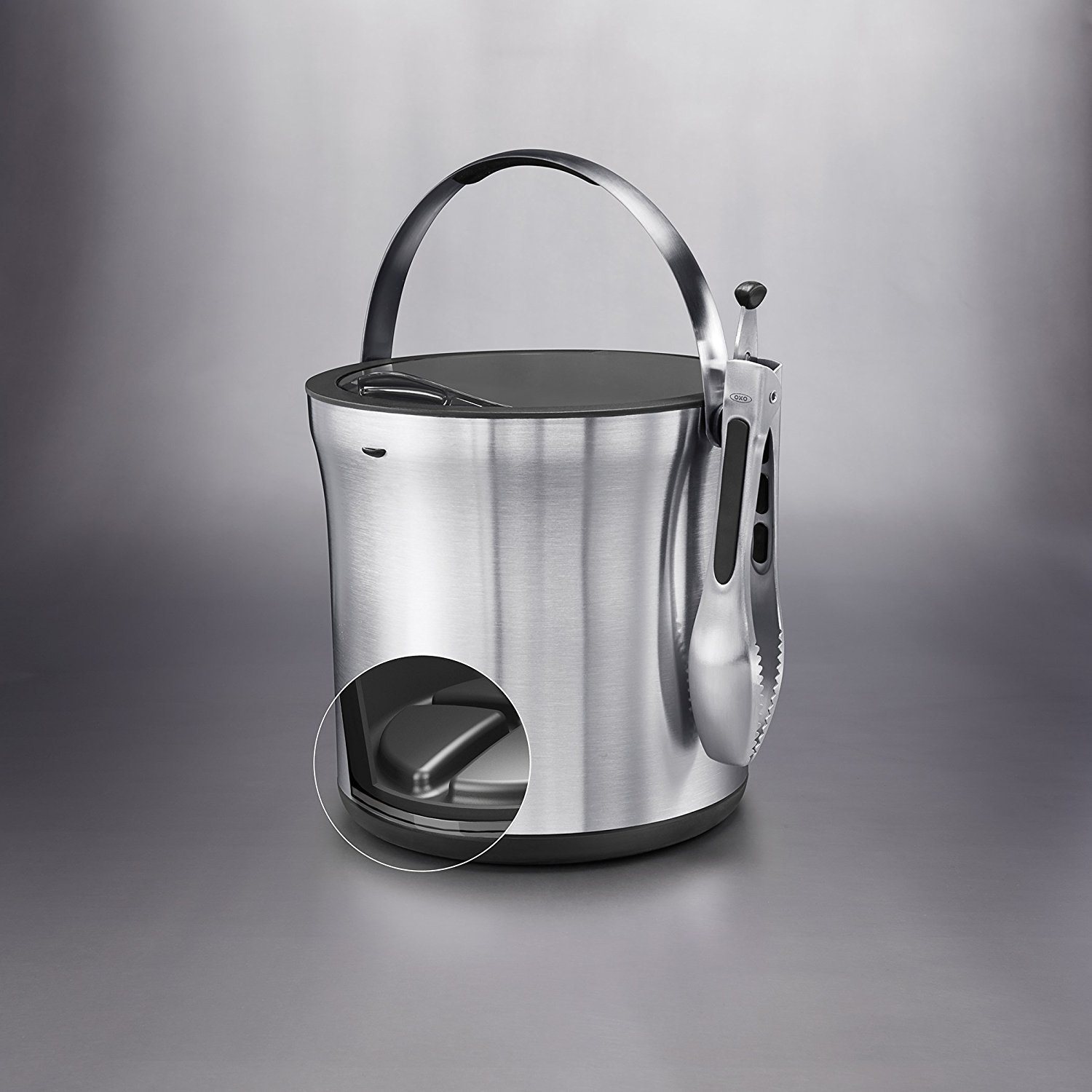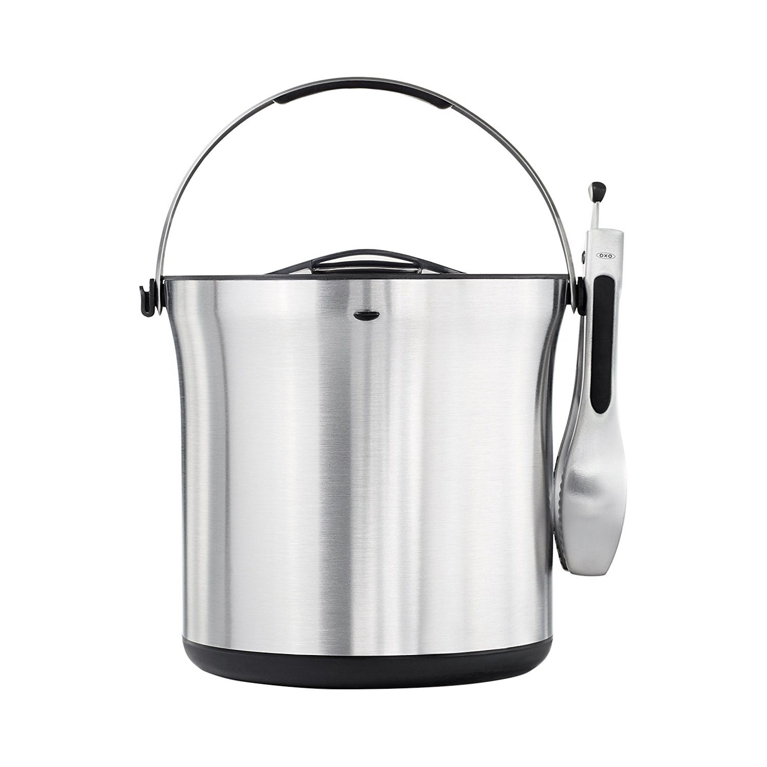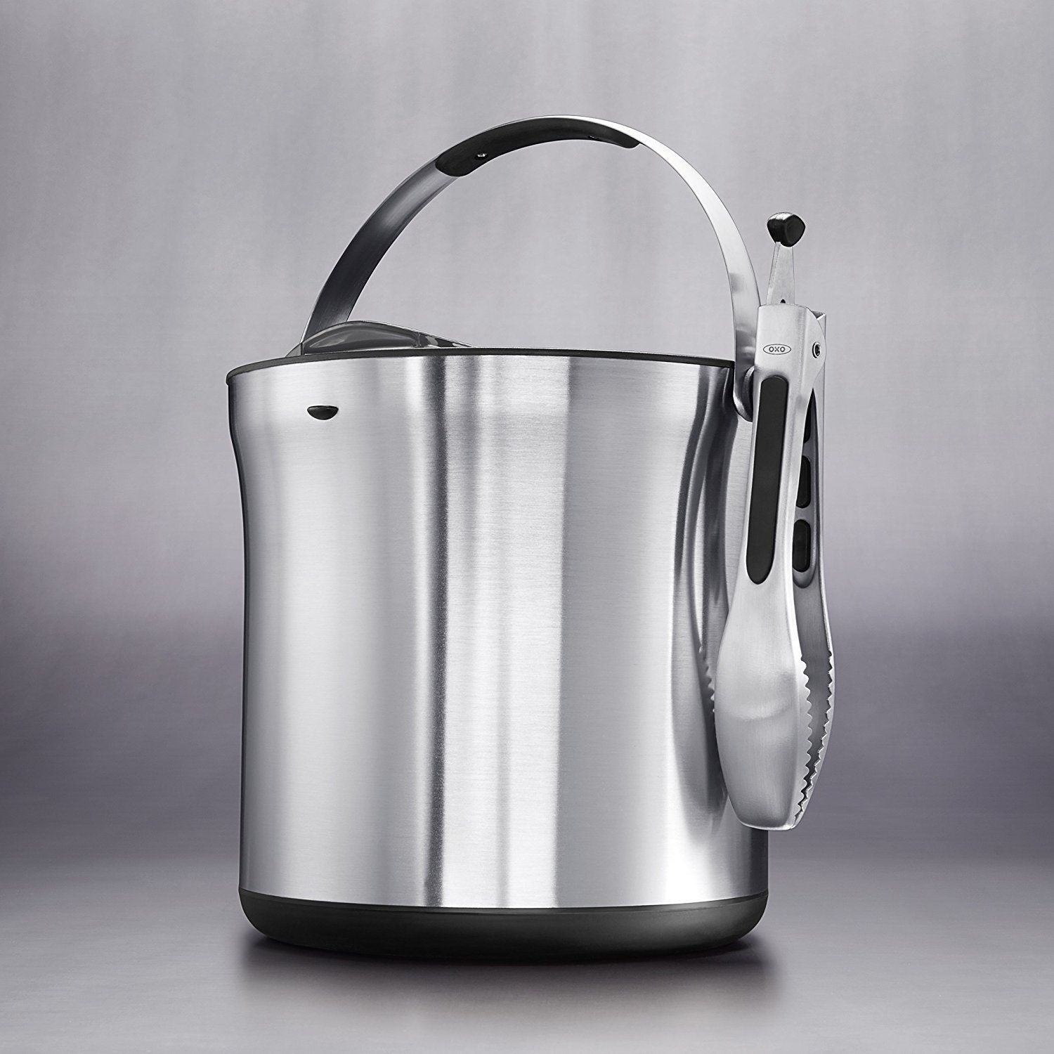 Juego de cubitera y pinzas para hielo , marca OXO , fabricado en acero inoxidable .