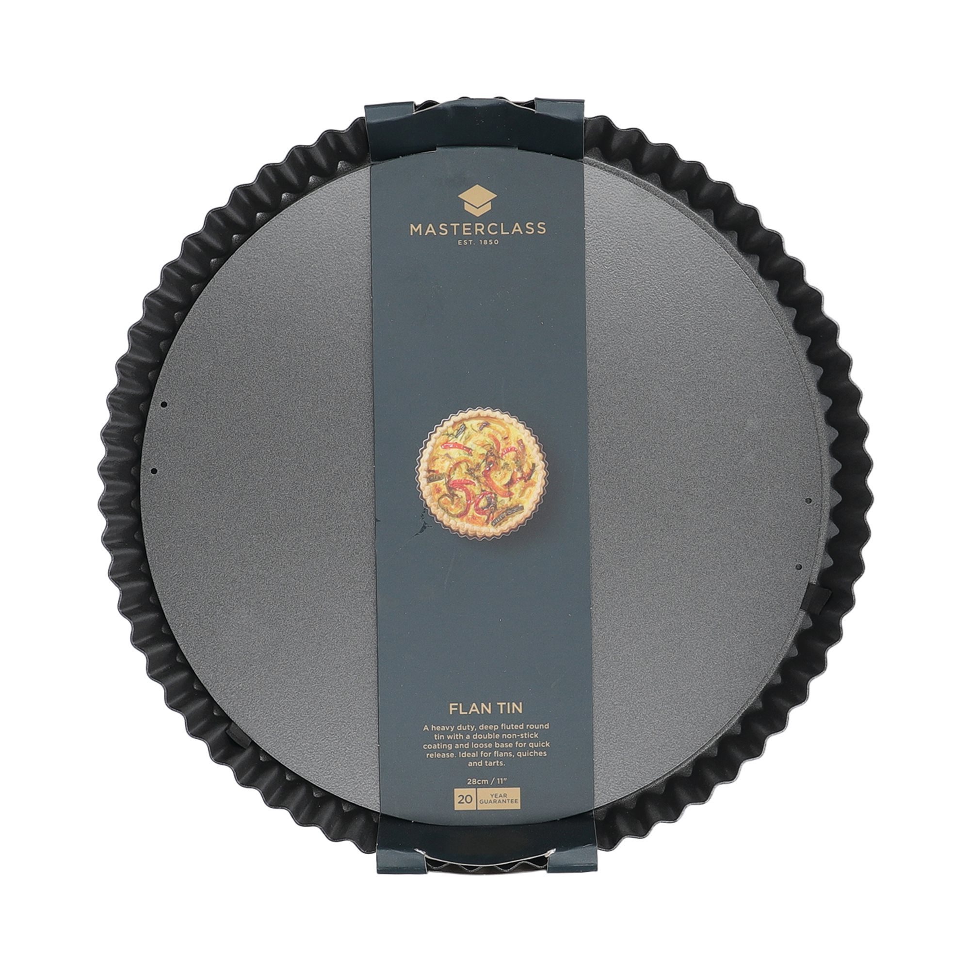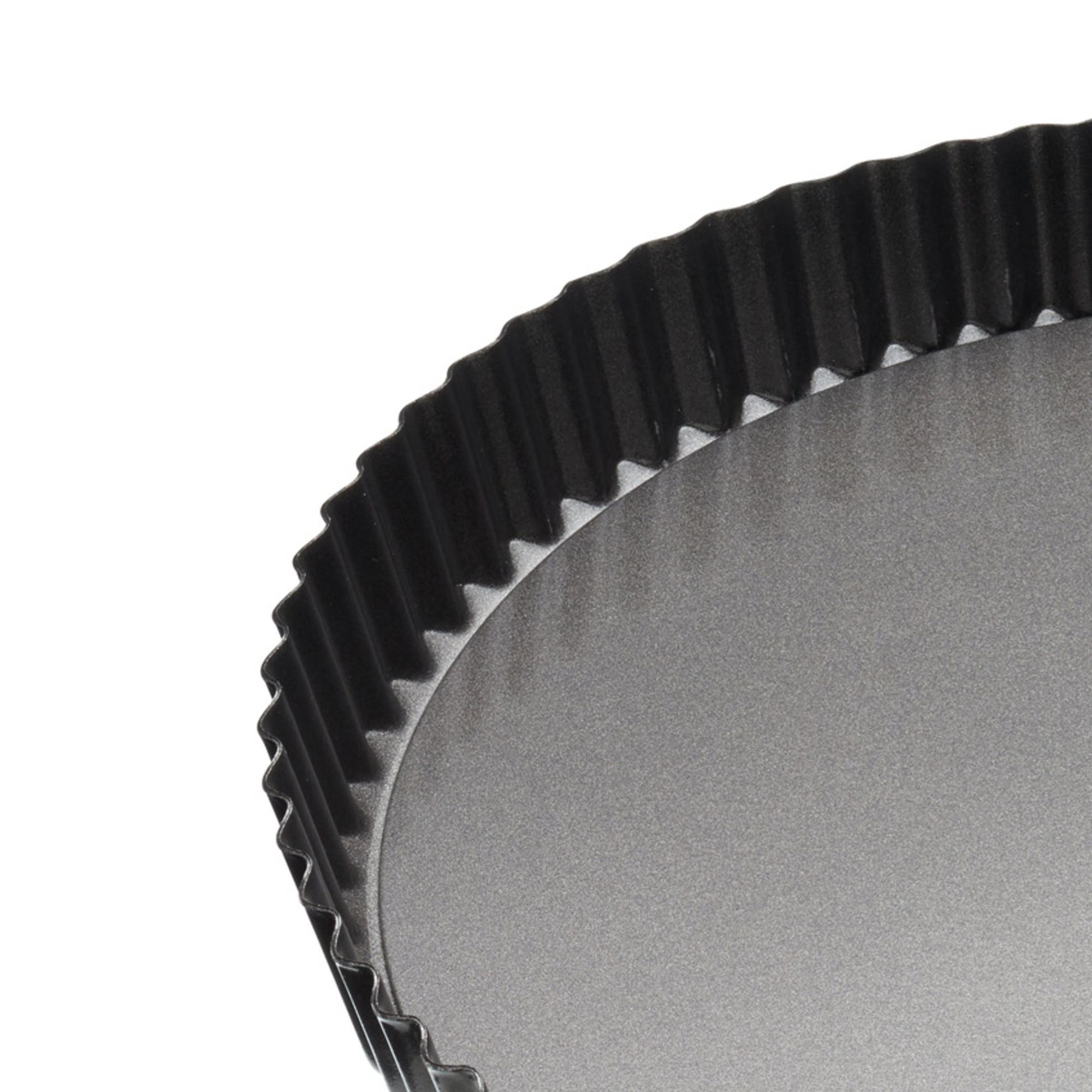 Fabricada en acero al carbono resistente, la bandeja cuenta con una capa antiadherente que permite un horneado uniforme, sin pegamento, y un fácil desmoldado posterior. La bandeja redonda con bordes acanalados y base desmontable, con un diámetro de 28 cm, está preparada para un uso intensivo, respondiendo con éxito a todos sus desafíos en la cocina.