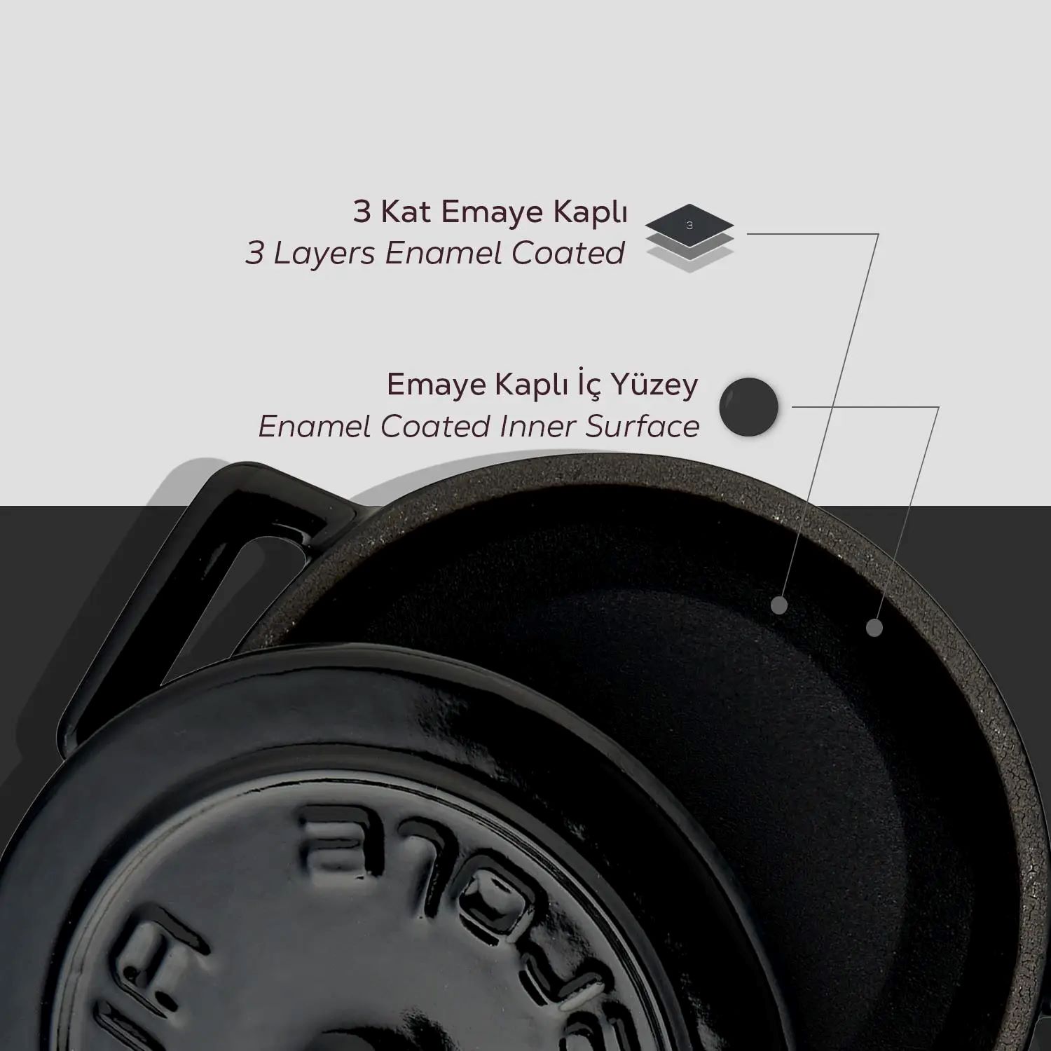 Kastruli seinte paksus on 3 mm. Seestpoolt on toode kaetud ühe musta emaili kihiga, mis hõlbustab rasvaga küpsetamisel mittenakkuva pinna teket.
