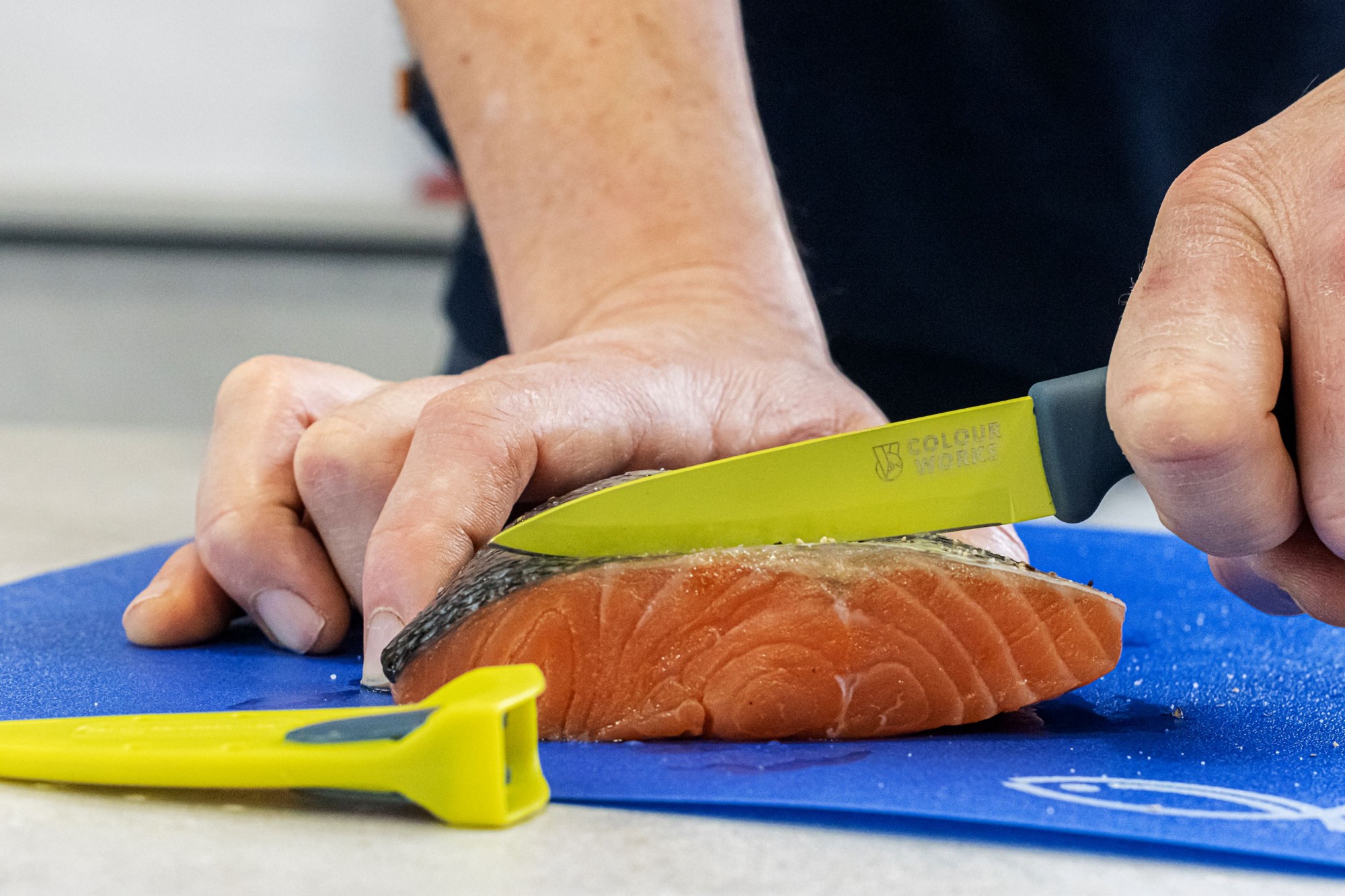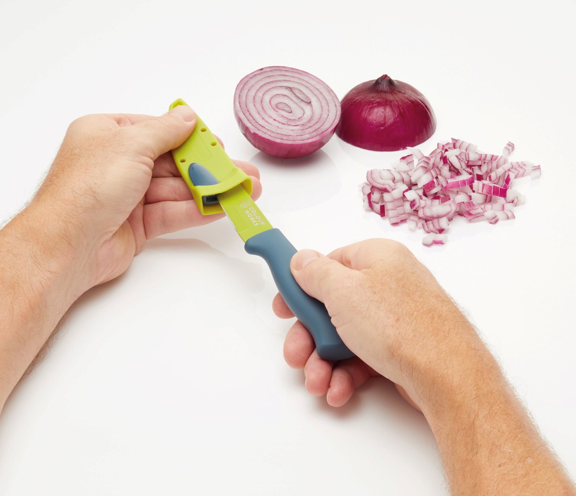 Viipaloi, leikkaa kuutioiksi, kuori ja pilko vihannekset ja hedelmät tällä tarttumattomalla ruostumattomasta teräksestä valmistetulla teräveitsellä. Se sisältää Edgekeeper-tekniikalla varustetun suojavaivan, joka on teroitukseen joka kerta, kun käytät sitä, ja turvallisen varastoinnin.