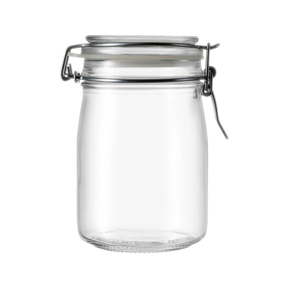Ilmatiivis puristimella varustettu purkki, valmistettu Italiassa, erikoisvalkoisesta laadukkaasta lasista, Borgonovo-merkki.