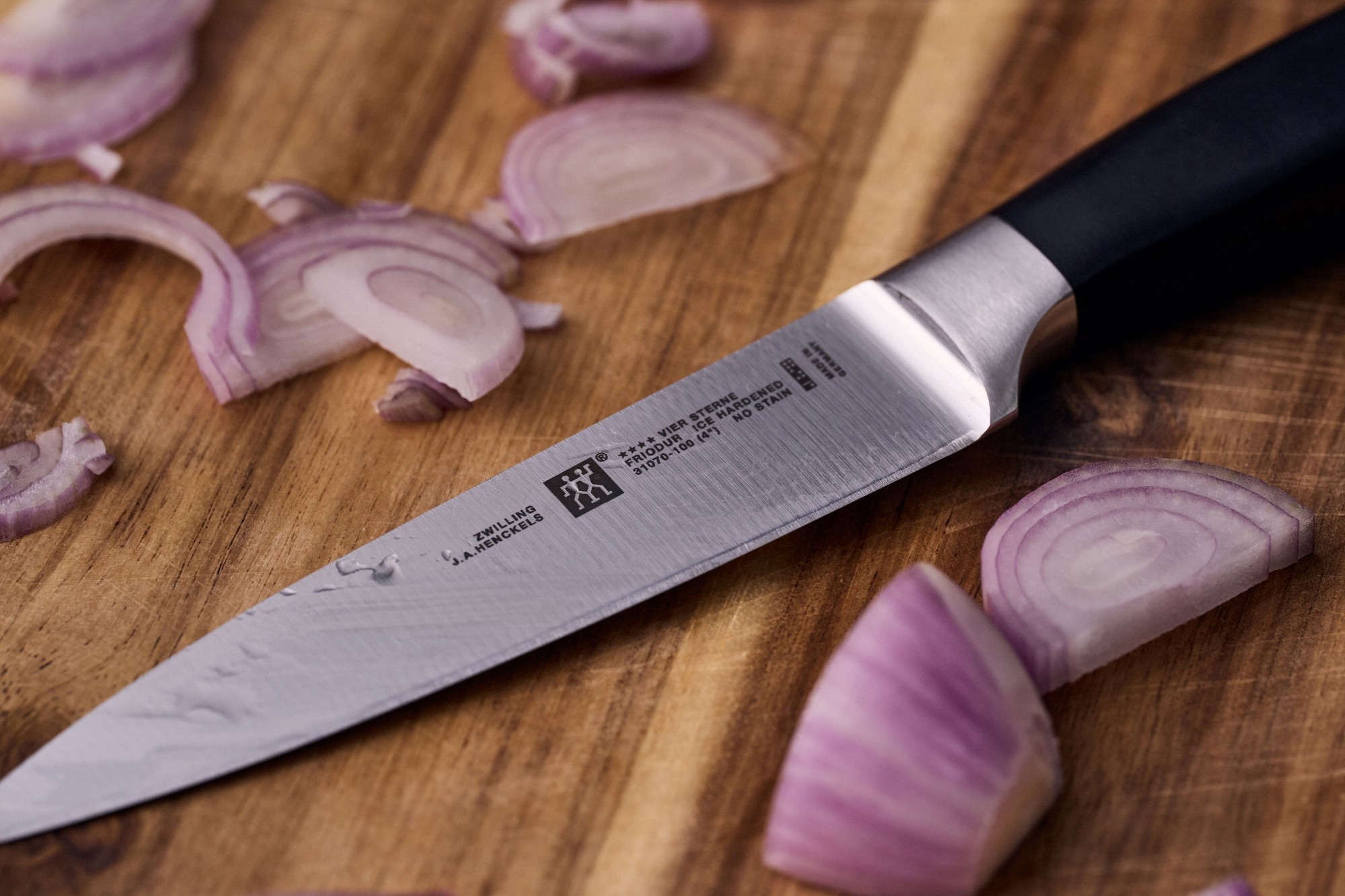 Couteau de marque Zwilling pour l’élimination des pelures, avec une lame de 10 cm de long en acier inoxydable spécial résistant à la corrosion et aux chocs.