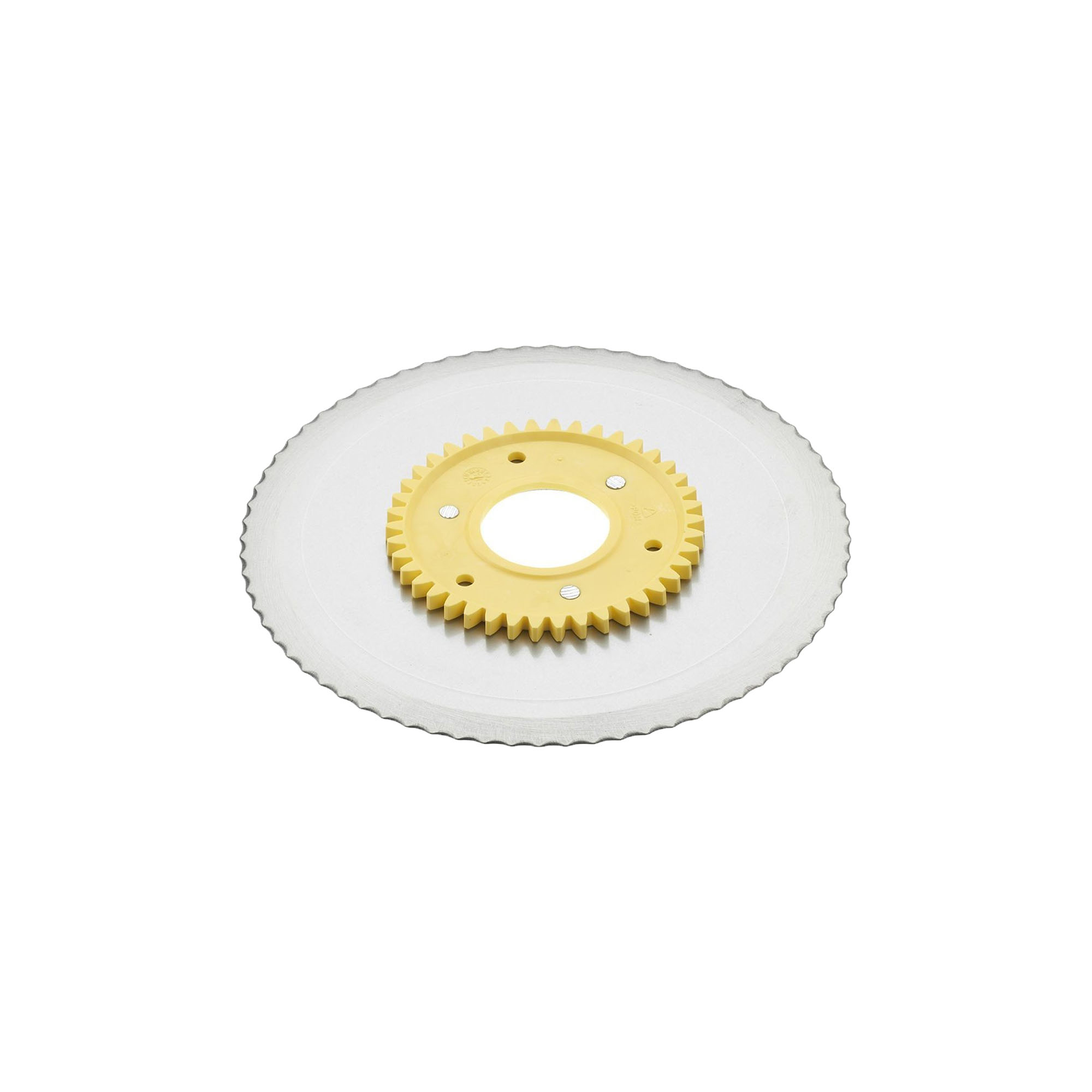 Lame circulaire dentelée avec engrenage jaune, produite par Ritter, d’un diamètre de 17 cm, en acier inoxydable, adaptée aux trancheuses électriques domestiques Ritter.