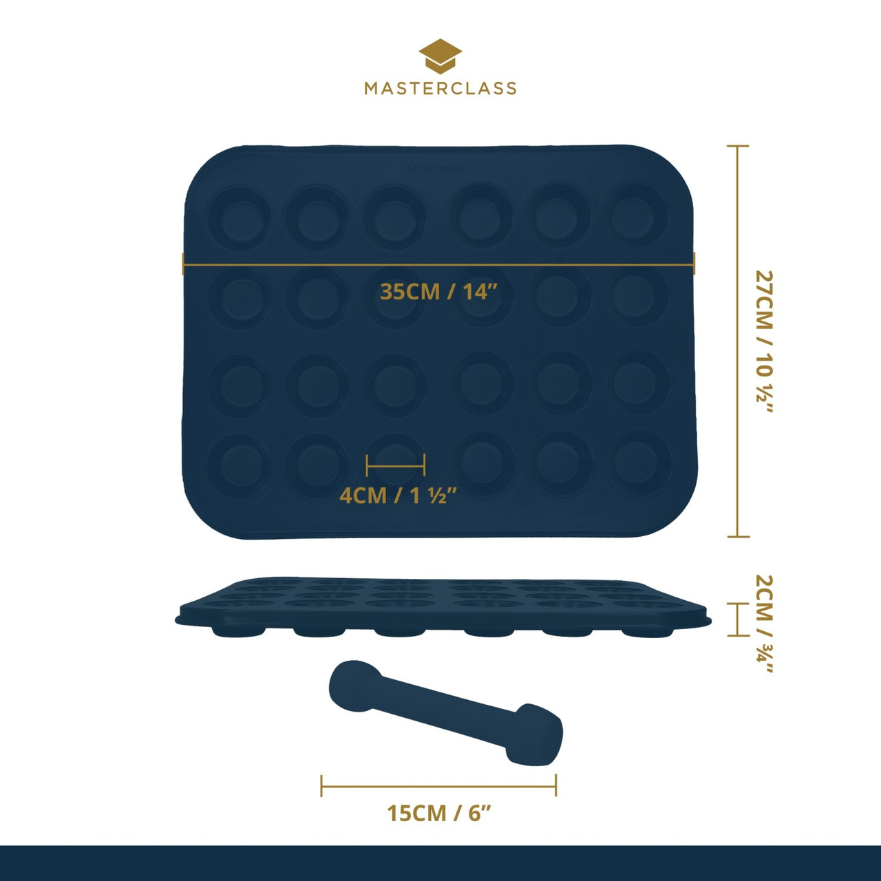 Le moule à pâtisserie comporte 24 compartiments d'un diamètre de 4 cm et d'une profondeur de 2 cm chacun. Le moule à pâtisserie est livré avec une presse en bois.