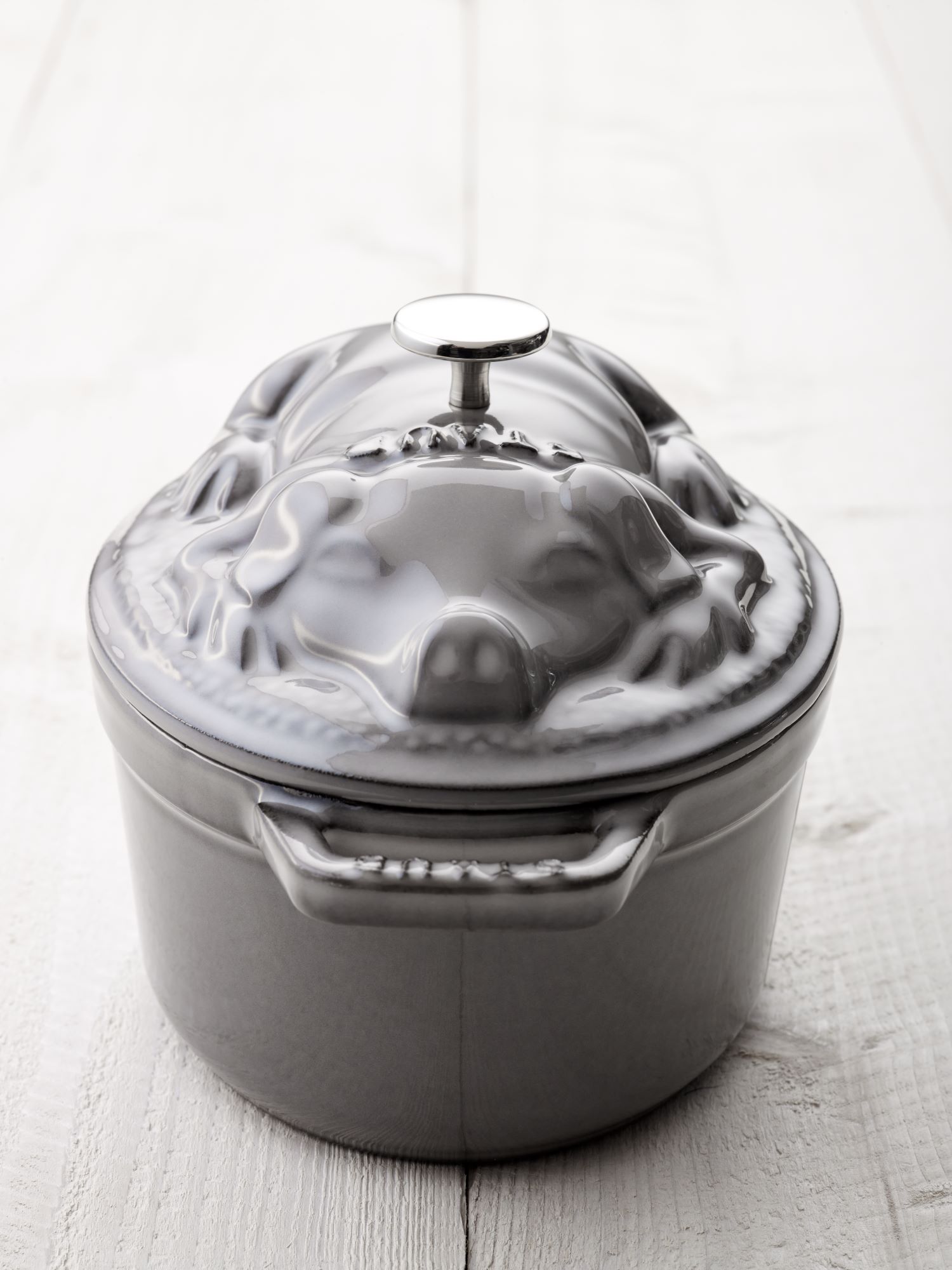 Sáspan Cocotte, branda Staub, trastomhas 17 cm, cumas 1 l, déanta as iarann teilgthe,a bhfuil dearadh an-tarraingteach aige.