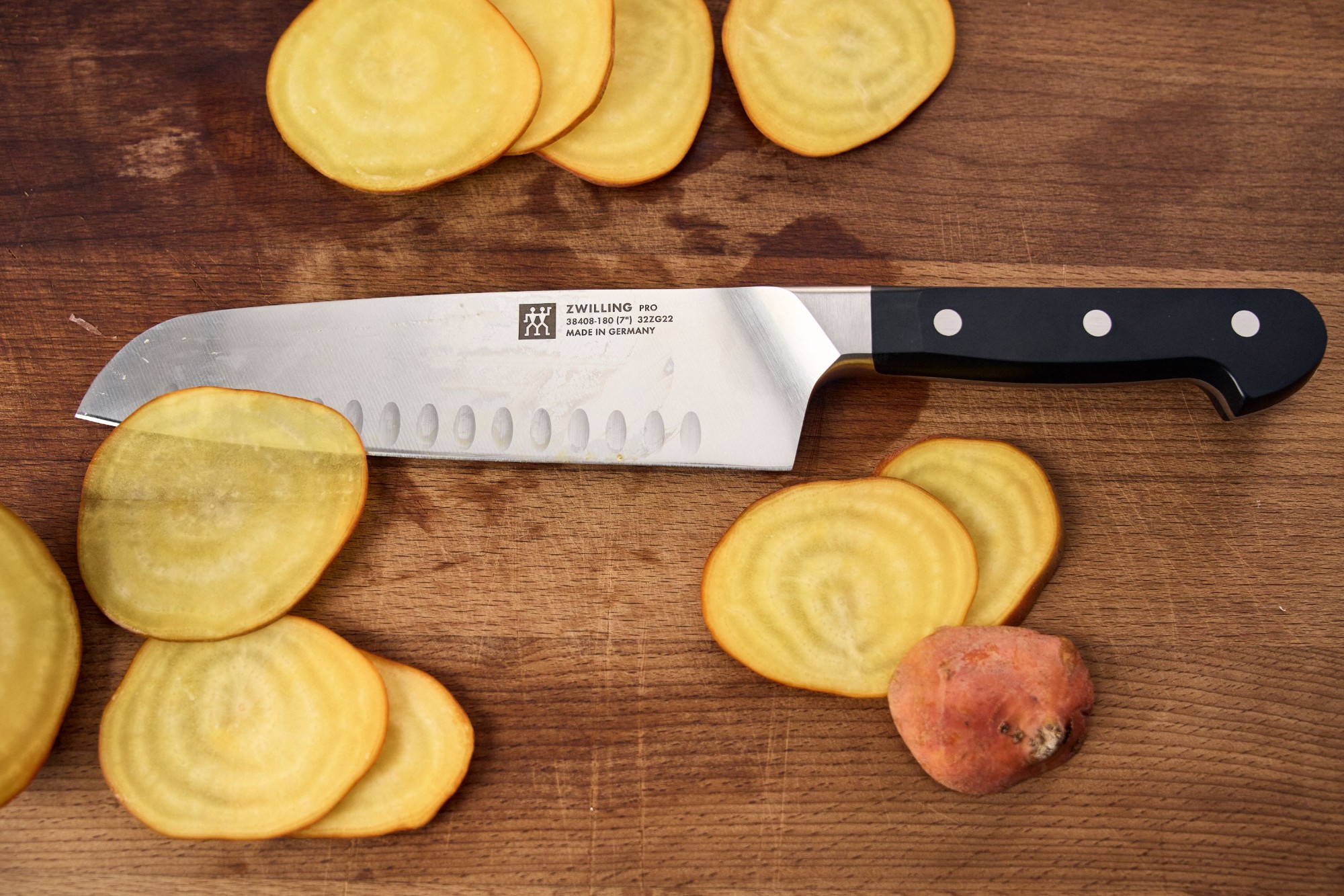 Scian Santoku, branda Zwilling, le lann fada 18 cm le eanguithe, a mhonaraítear ó chruach dhosmálta speisialta ar aon dul leis na caighdeáin is airde, creimeadh-cruthúnas agus turraing-cruthúnas.