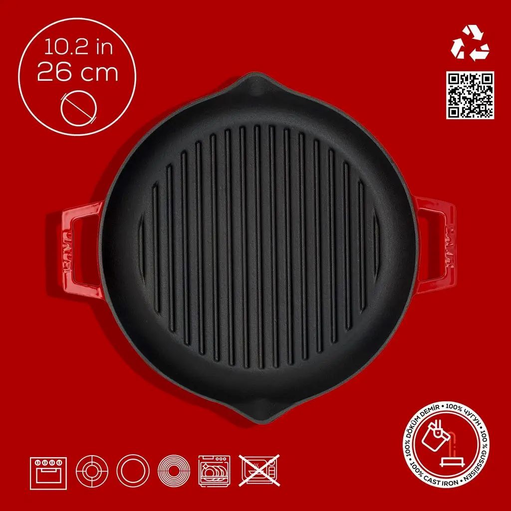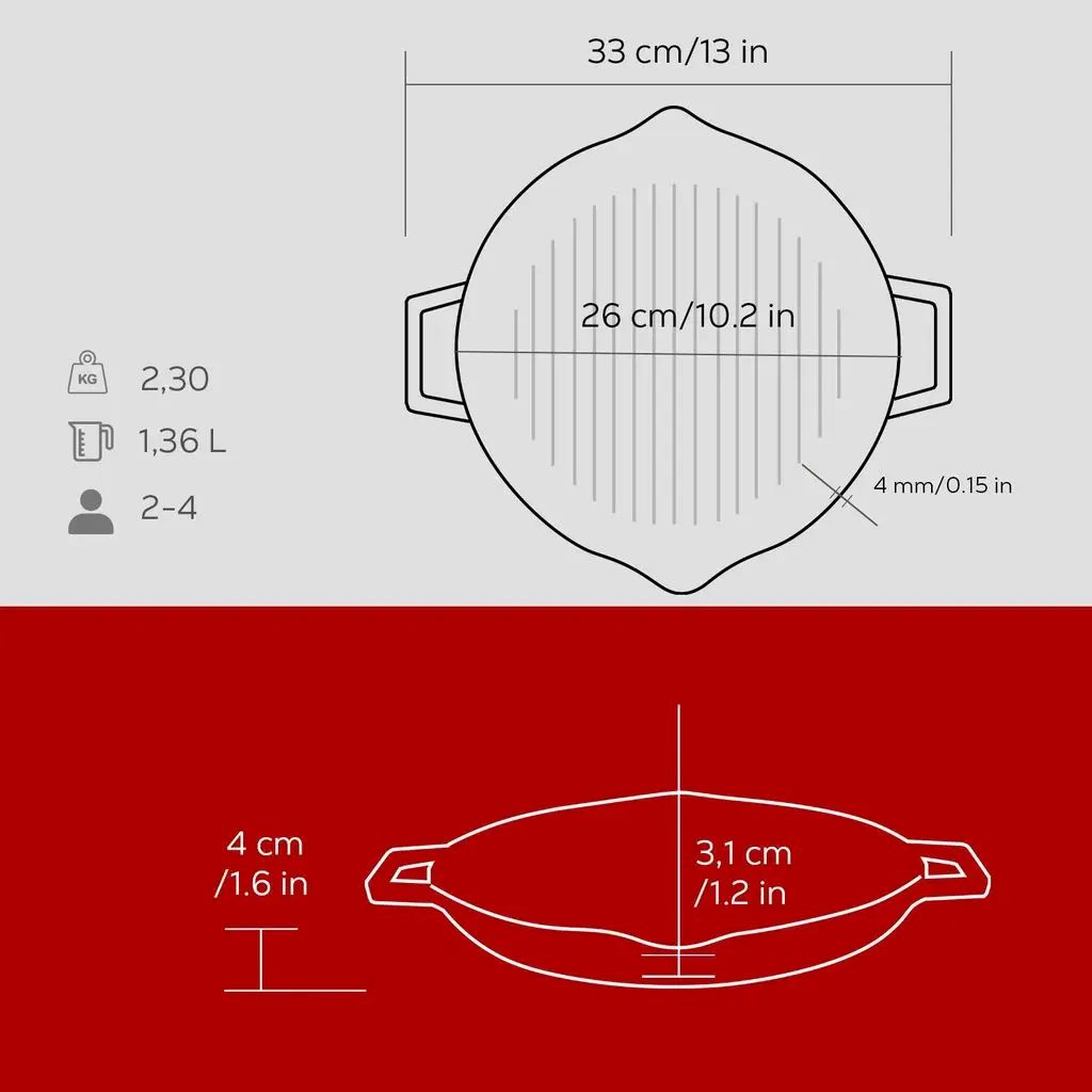 Grill serpenyő, Láva márka, 26 cmbelső átmérője, kapacitása 1,36 l, öntöttvasból készült.
