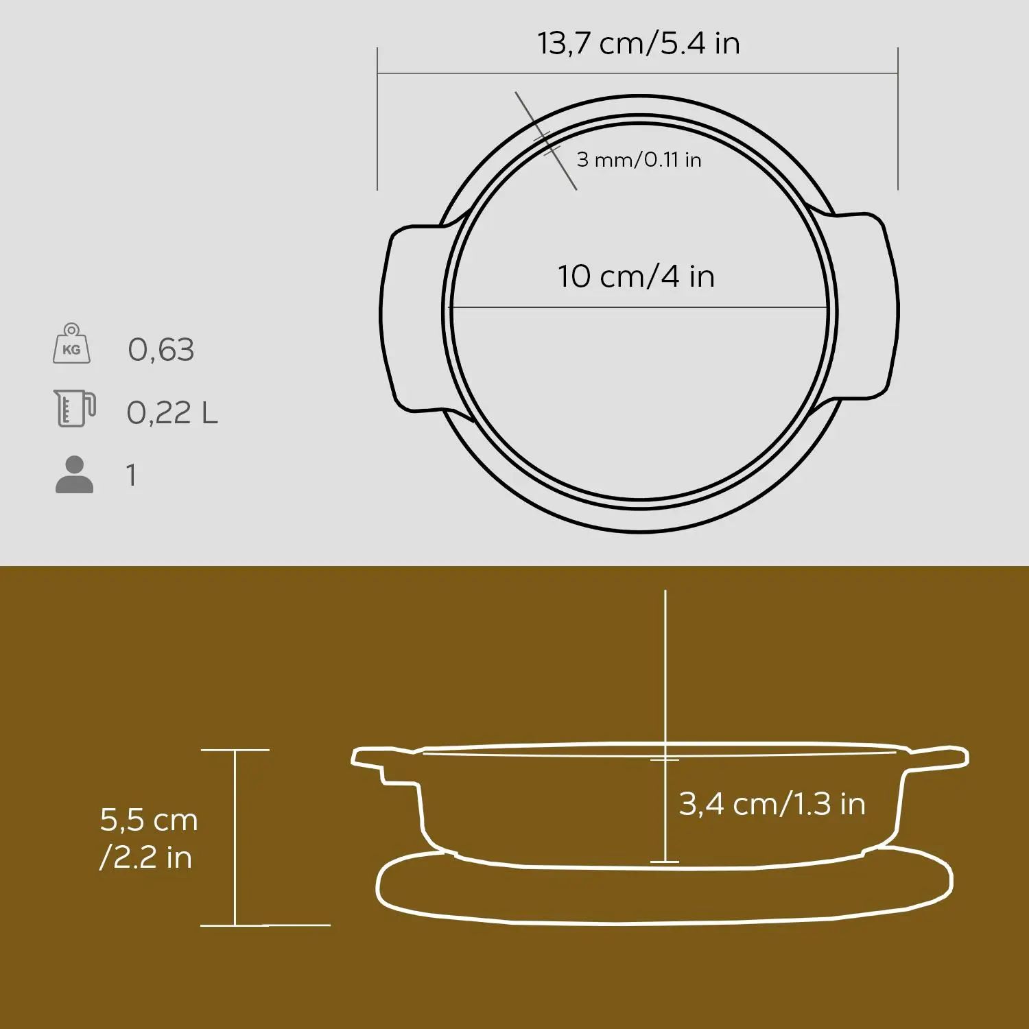 Apvalus mini puodas su stovu, pagamintas Lava, 10 cm skersmens, talpa 0,22 l, pagamintas iš ketaus. Stovas pagamintas iš buko medienos , jo skersmuo – 12 cm.