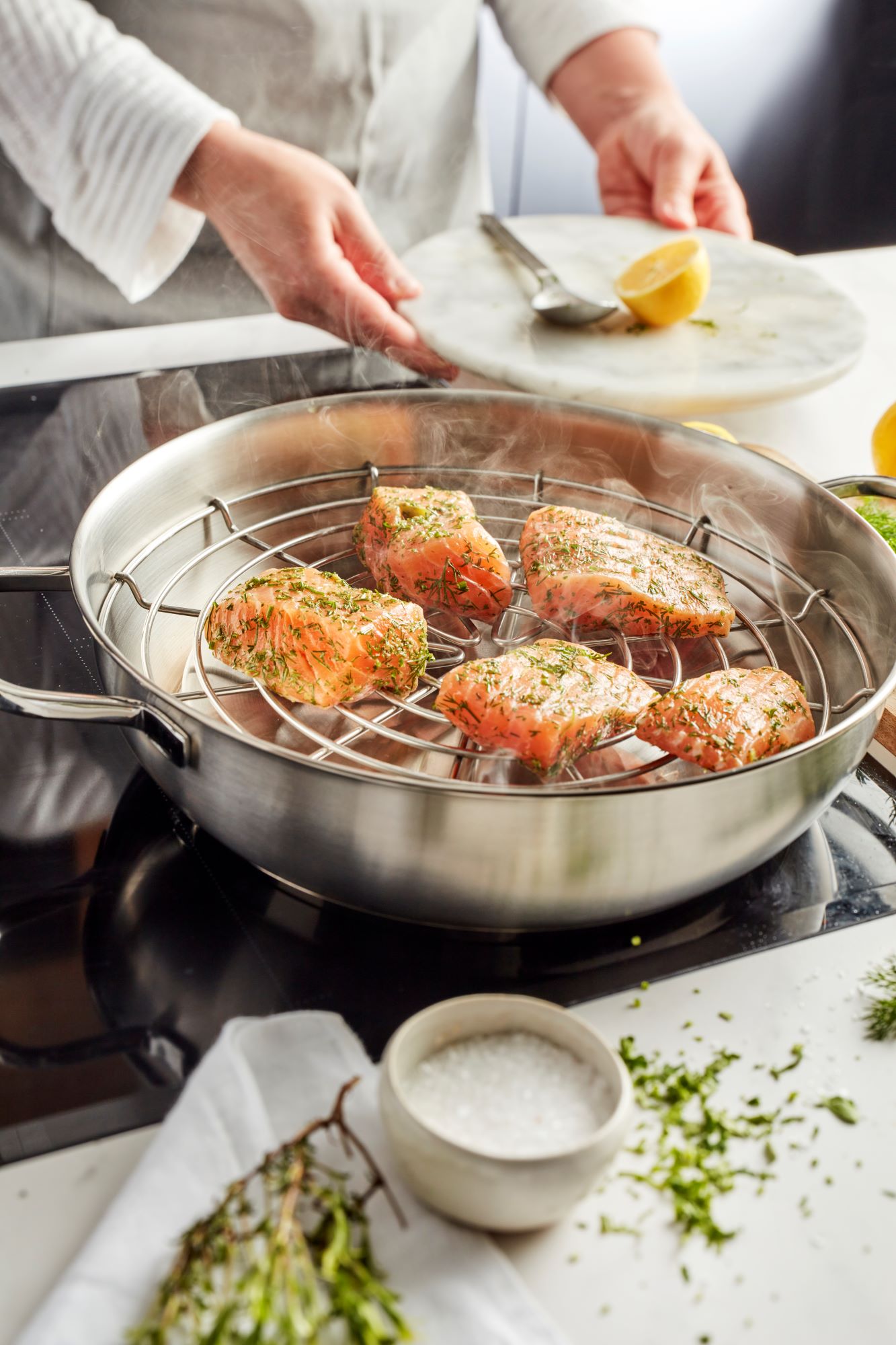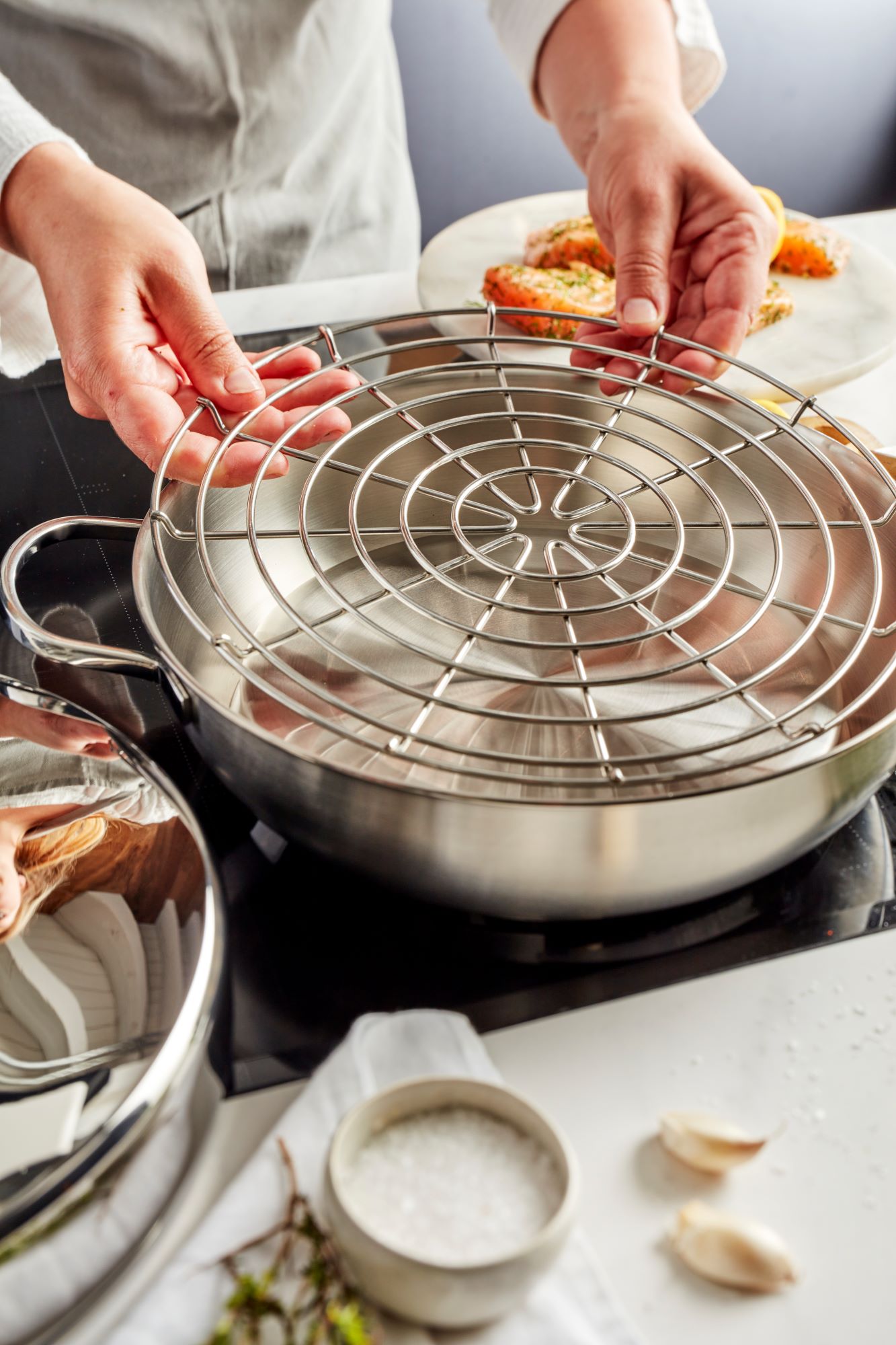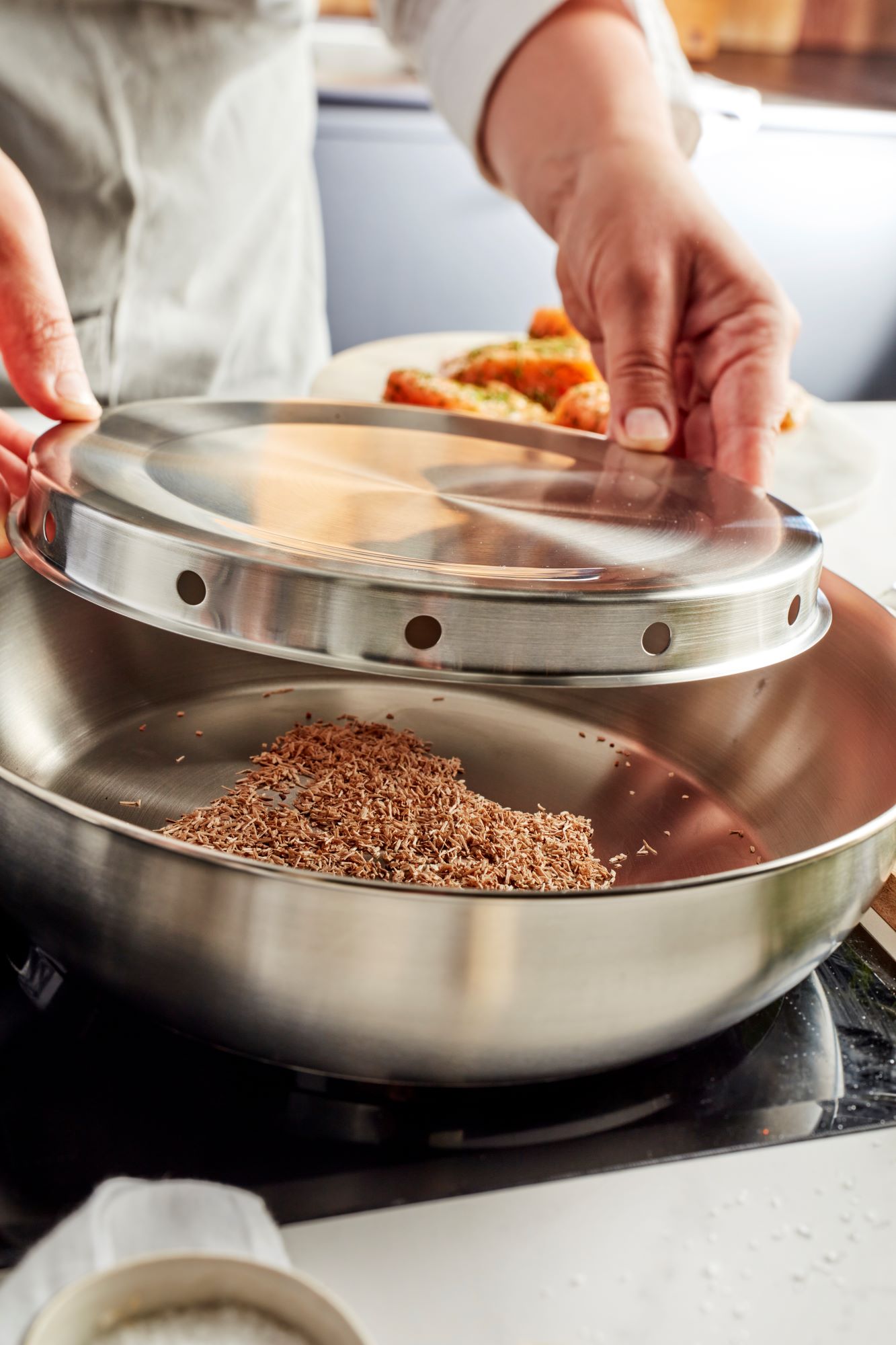 Rūkymas kaip maisto gaminimo technika tampa vis populiaresnė, todėl „Demeyere“ sukūrė šį rūkymo rinkinį , kurį sudaro: 28 cm skersmens keptuvė, rūkymo kamera, grotelės ir aukštas dangtis.