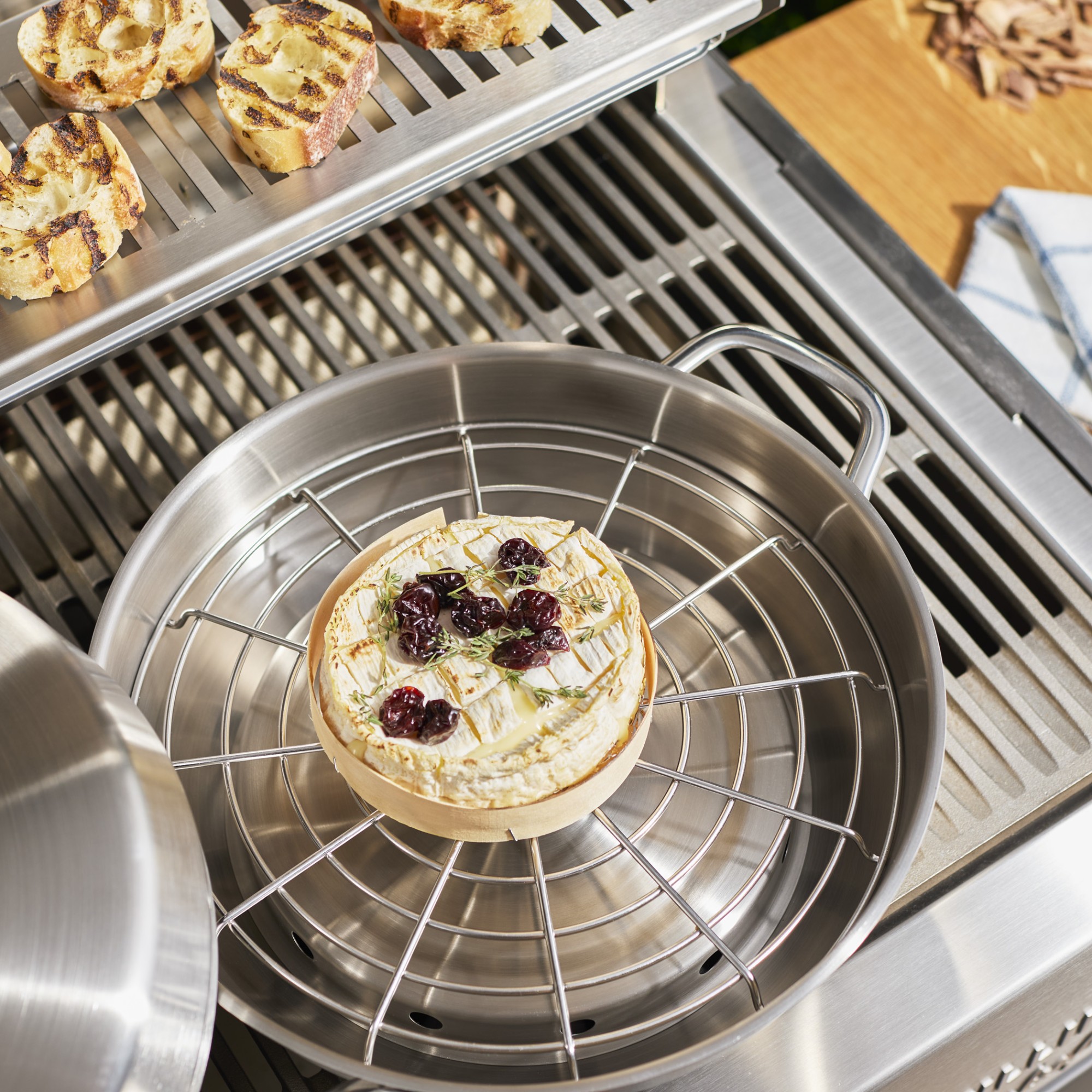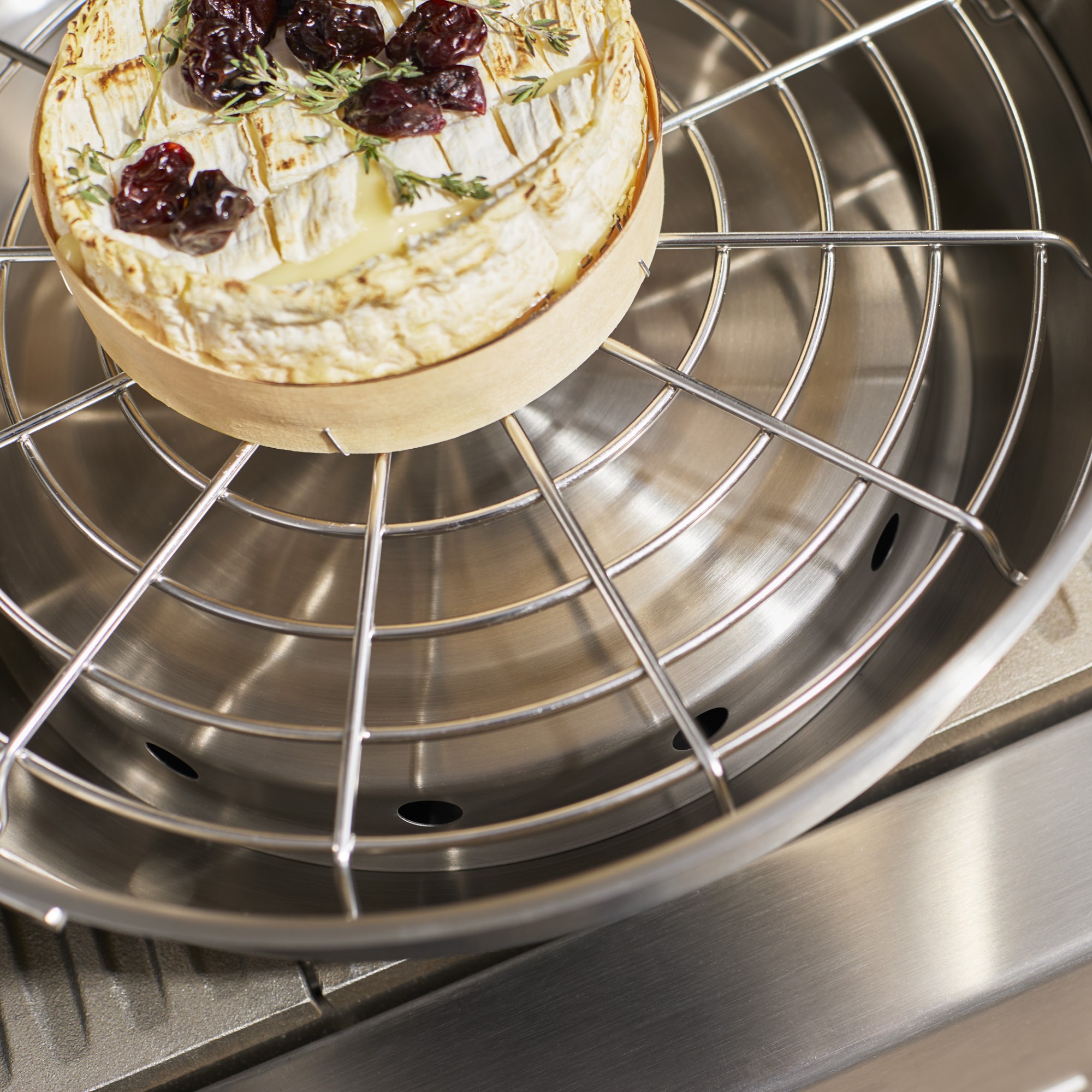 Rūkymo kameroje yra perforacijos, leidžiančios dūmams lengvai cirkuliuoti, kartu apsaugant juos nuo lašančio vandens ir riebalų. Kartu su garinimo grotelėmis rūkymo rinkinys suteikia jūsų ingredientams intensyvų, būdingą dūmo skonį.