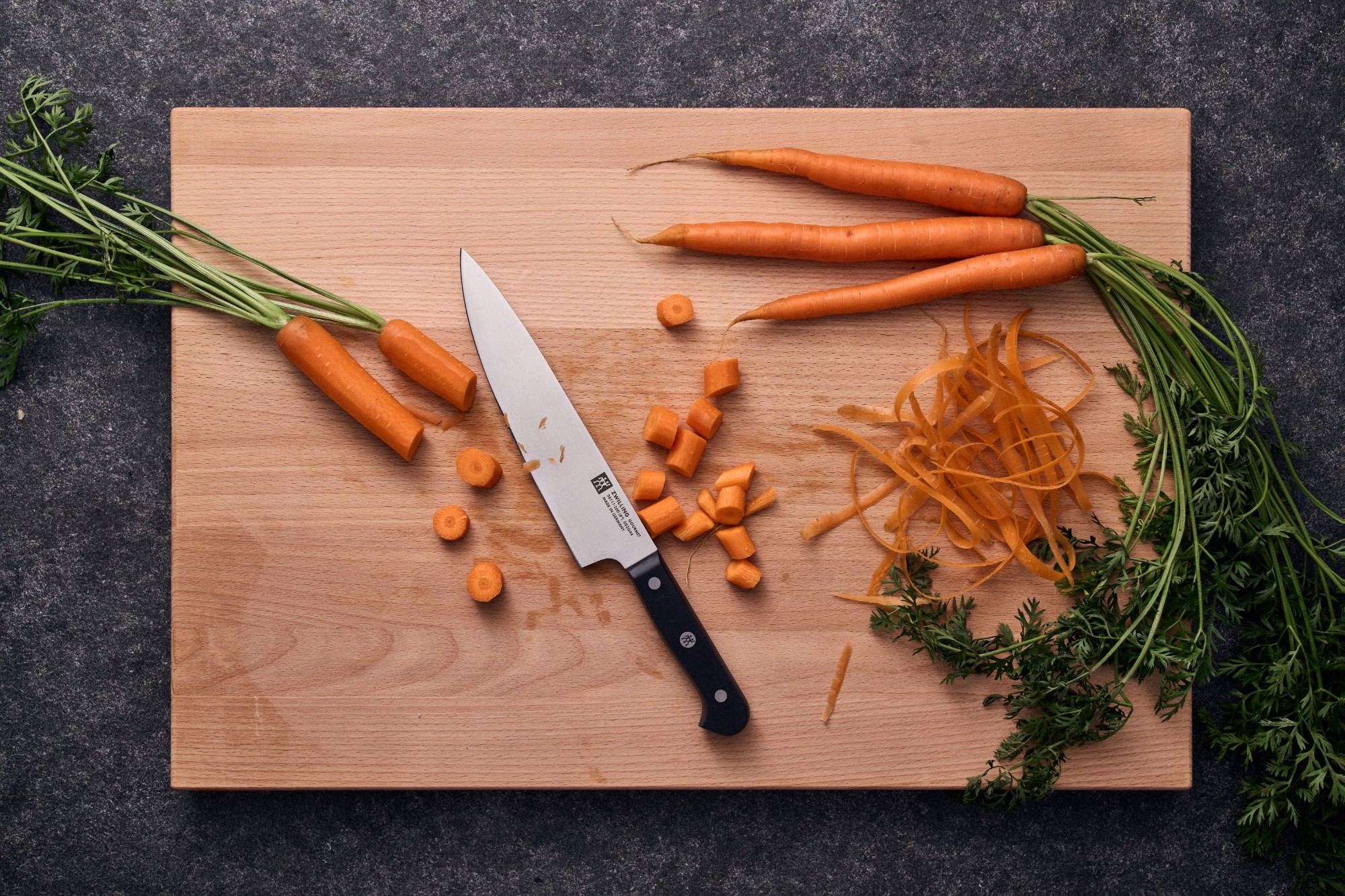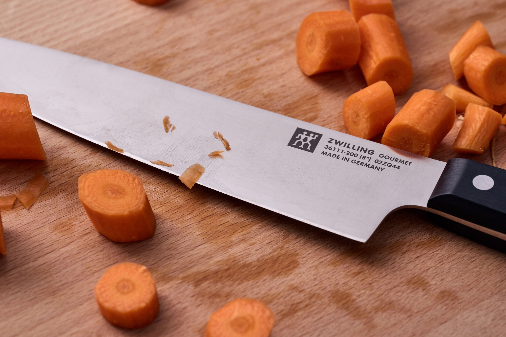 Virėjo peilis su 20 cm ilgio ašmenimis, pagamintas iš specialaus nerūdijančio plieno, todėl yra tvirtas, atsparus korozijai ir smūgiams, bet tuo pačiu ir lankstus, prekės ženklas Zwilling