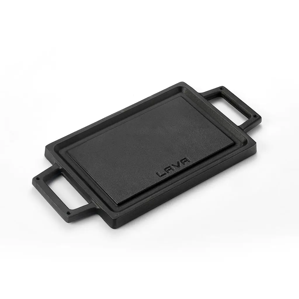 Apgriežams grils, izgatavots no čuguna, Lava zīmols. Produktam vienā pusē ir grils, bet otrā pusē — sildriņķis.