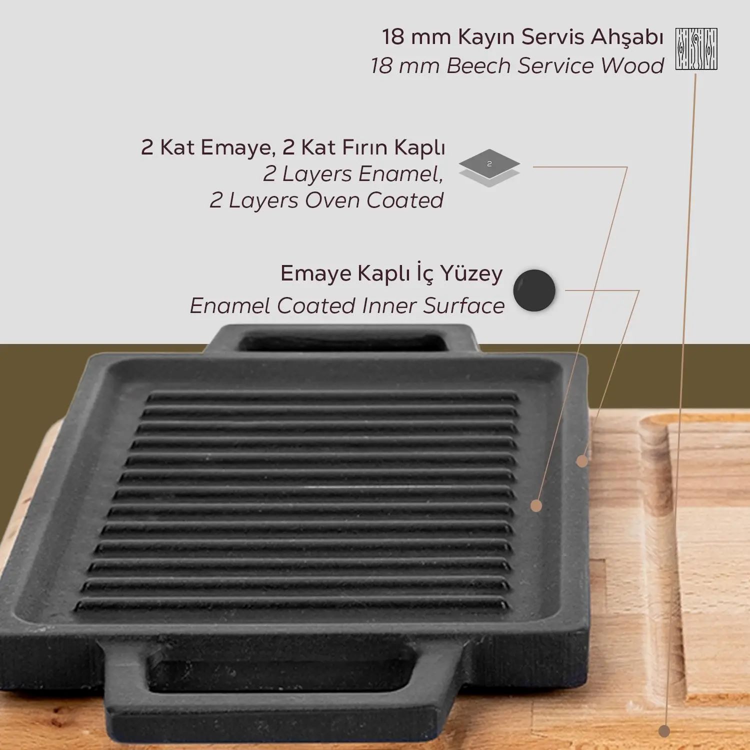 Il-hotplate hija ħoxna 7 mm minn ġewwa u ħoxna 16 mm fit-tarf. Il-prodott huwa miksi b'saff wieħed ta' enamel iswed li jiffaċilita l-formazzjoni ta' wiċċ li ma jwaħħalx meta ssajjar bix-xaħmijiet.Il-hotplate huwa adattat biex isservi porzjon 1-2.