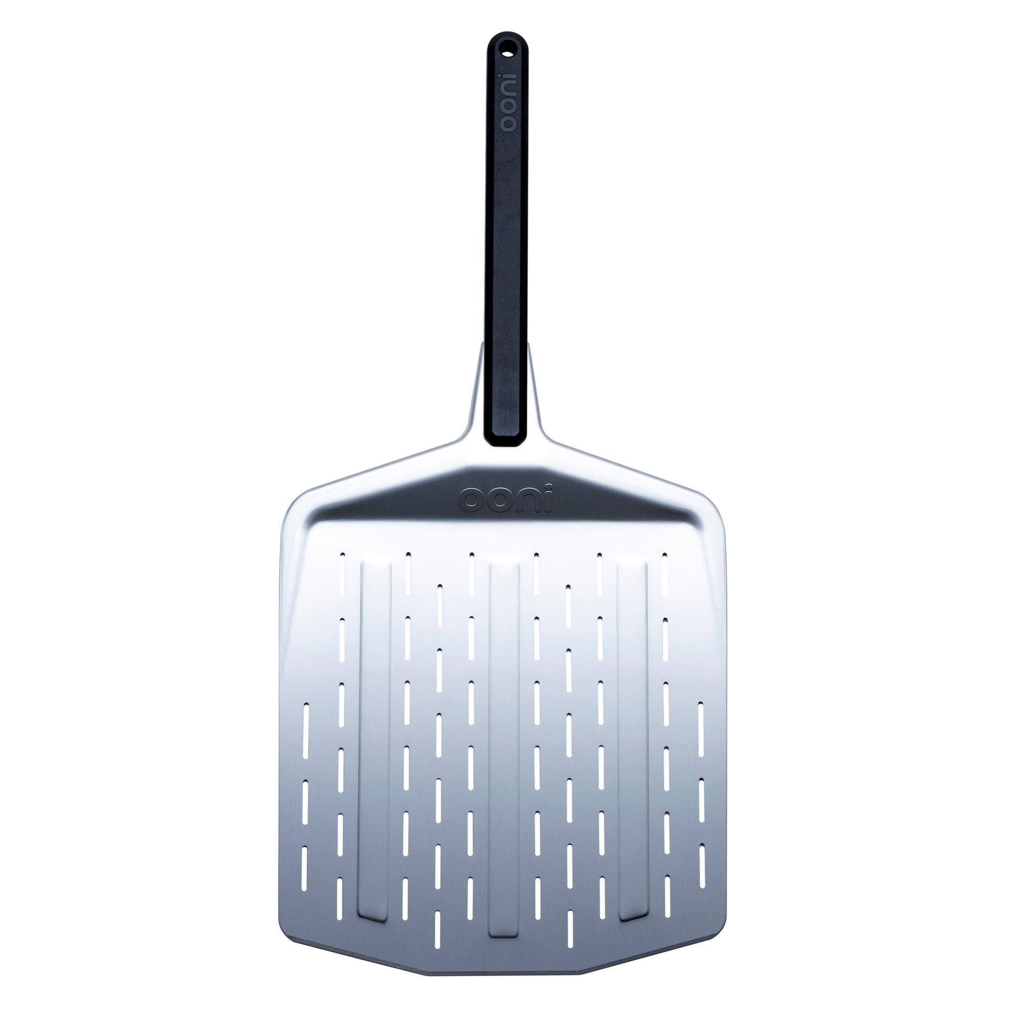 De geperforeerde paddle van Ooni, gemaakt van geanodiseerd aluminium met verbeterde corrosiebestendigheid en een hittebestendig plastic handvat, helpt je pizza te bereiden als een echte professional.
