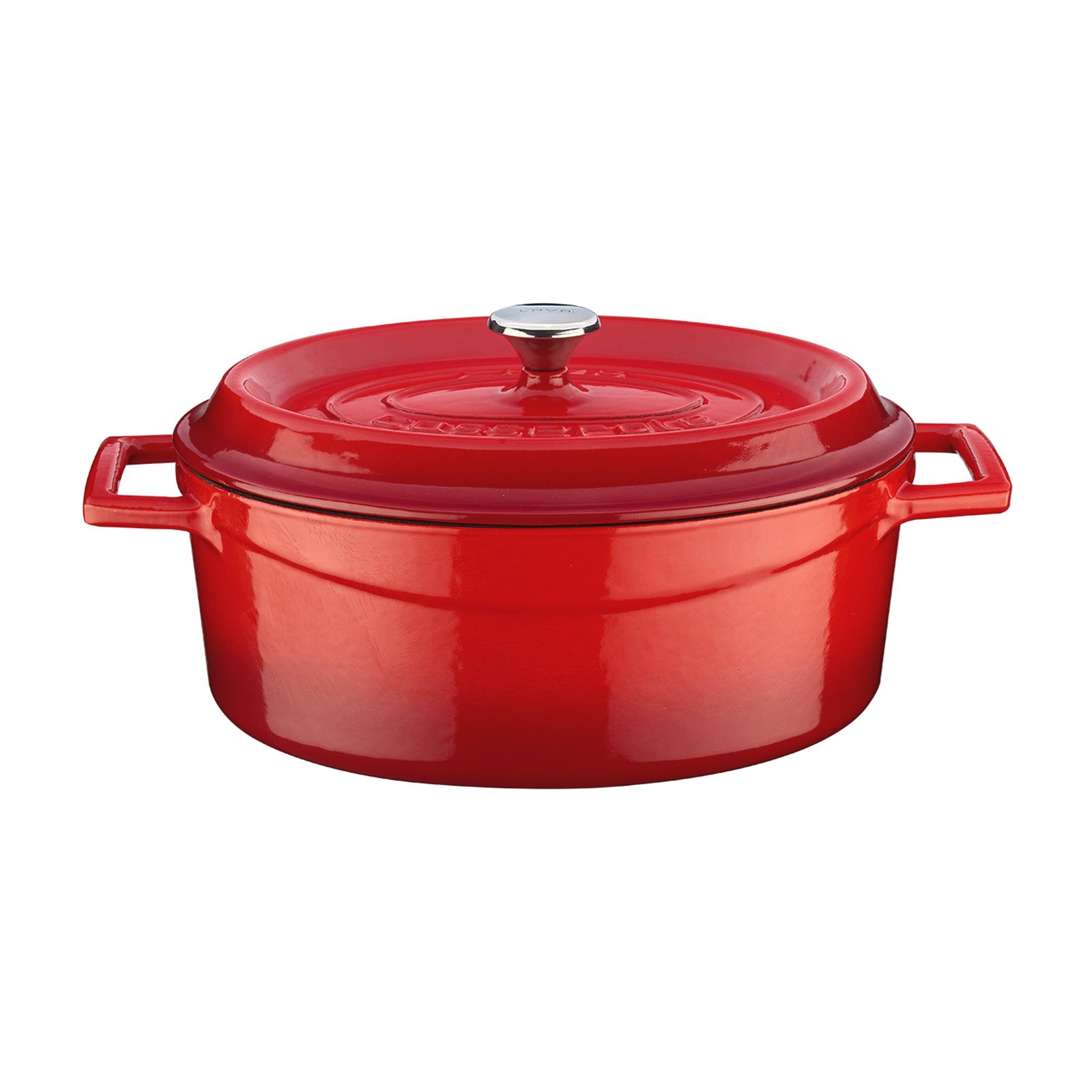 Ovaalvormige pan met deksel, lavamerk, diameter van 29 cm,inhoud van 4,7 l,gemaakt van gietijzer.