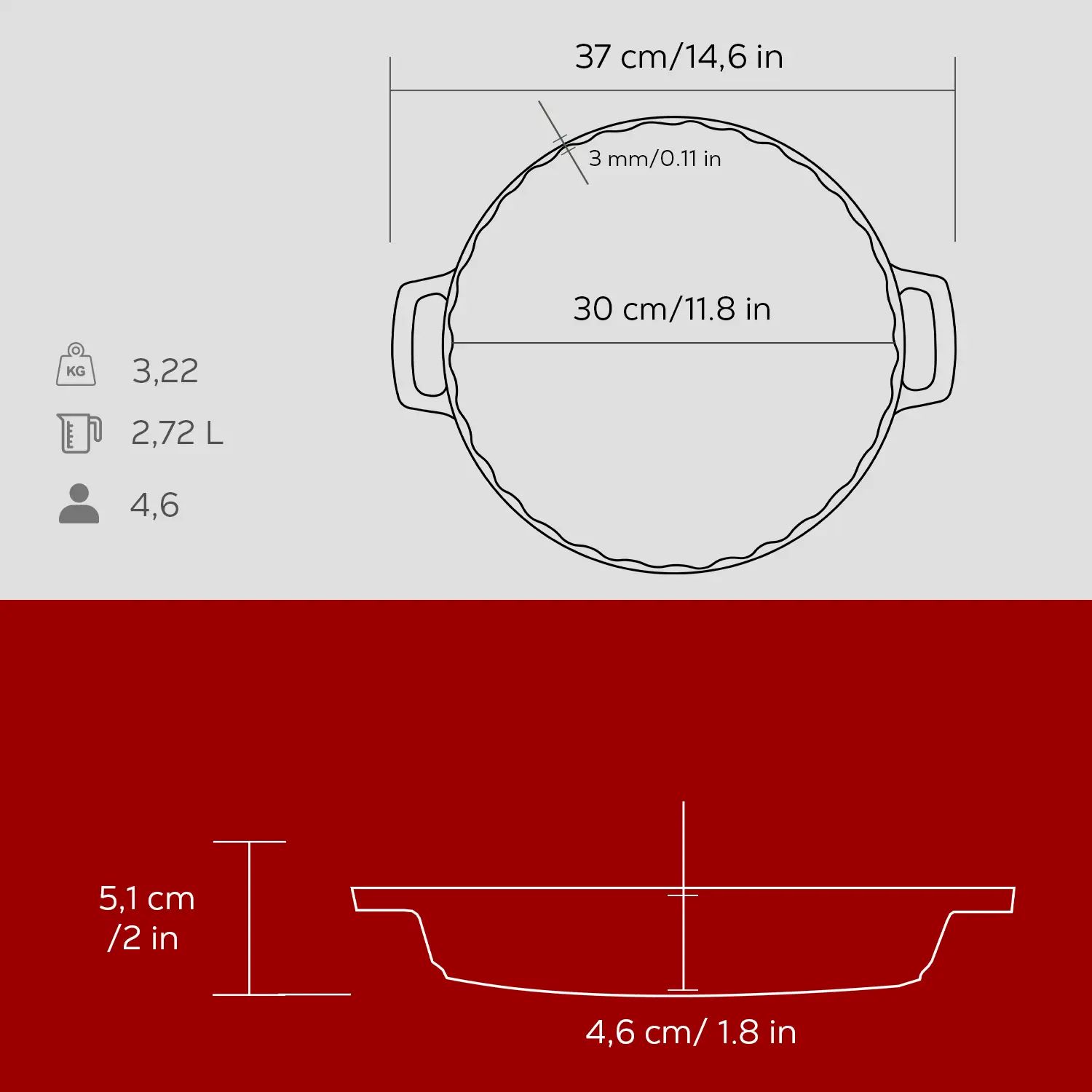 De wanddikte is 3 mm en aan de binnenkant is het product gecoat met één laag zwart email die de vorming van een antiaanbaklaag vergemakkelijkt bij het koken met vet.