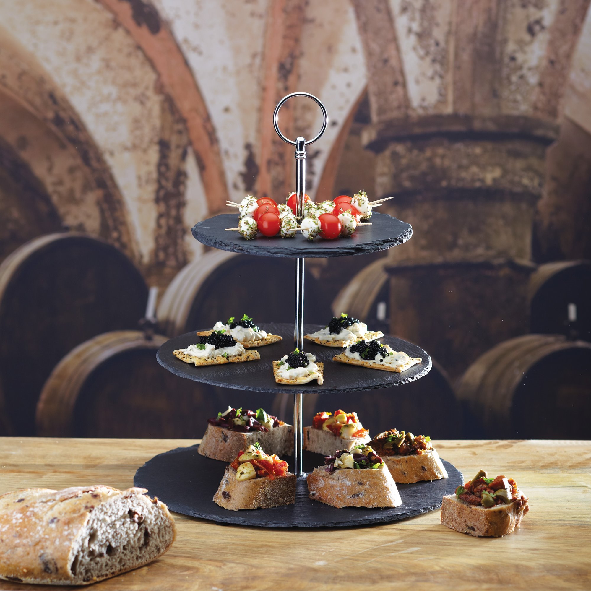 Het merk Artesa presenteert u een stijlvolle en uiterst nuttige oplossing, die ruimte bespaart op de overvolle tafels die specifiek zijn voor de feestdagen en tegelijkertijd alle gasten aan tafel zal verbazen met zijn eenvoud en elegantie. Dit is een verfijnde schotel met 3 niveaus voor het serveren van taarten, snacks en fruit, allemaal tegelijk!