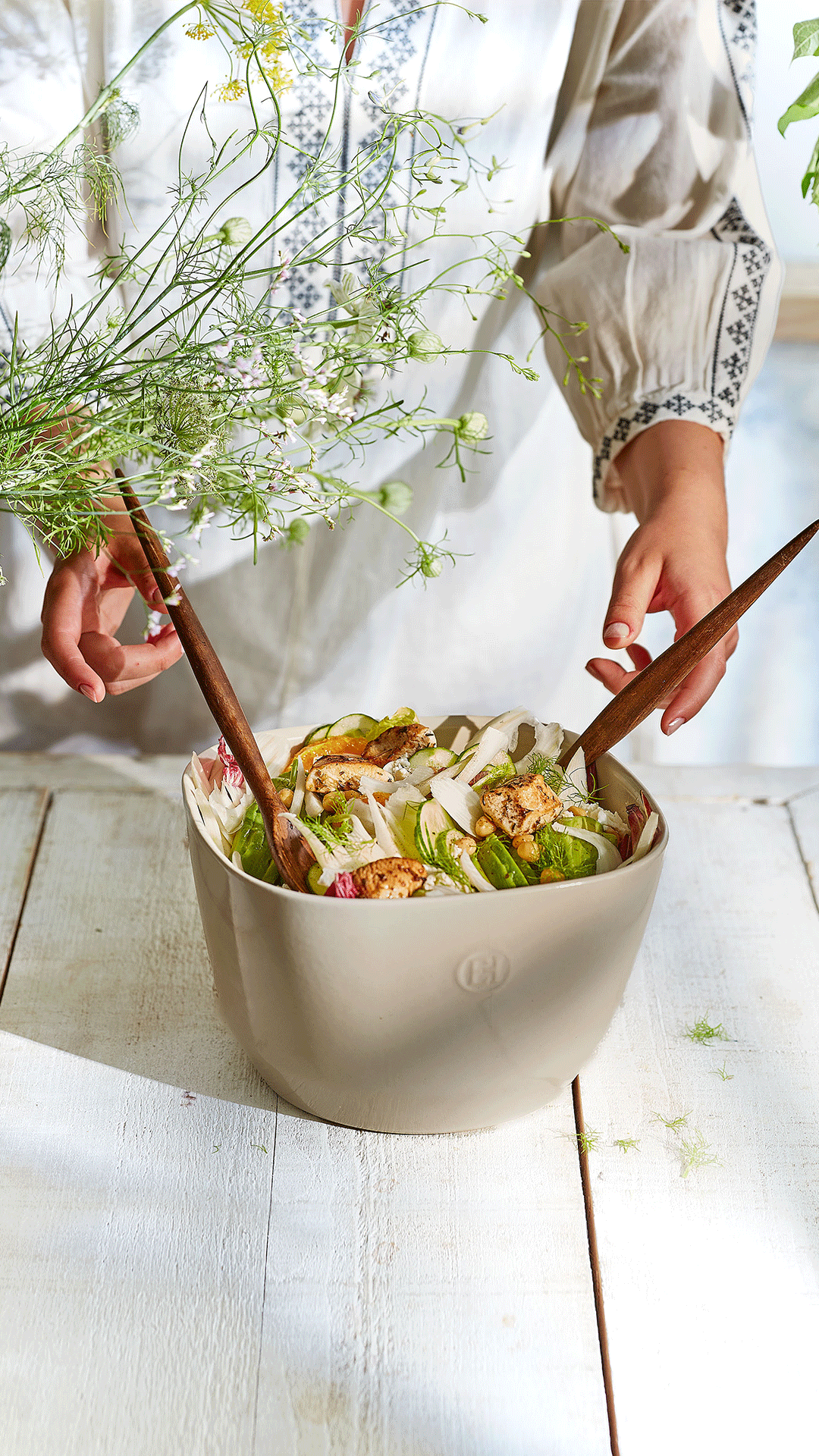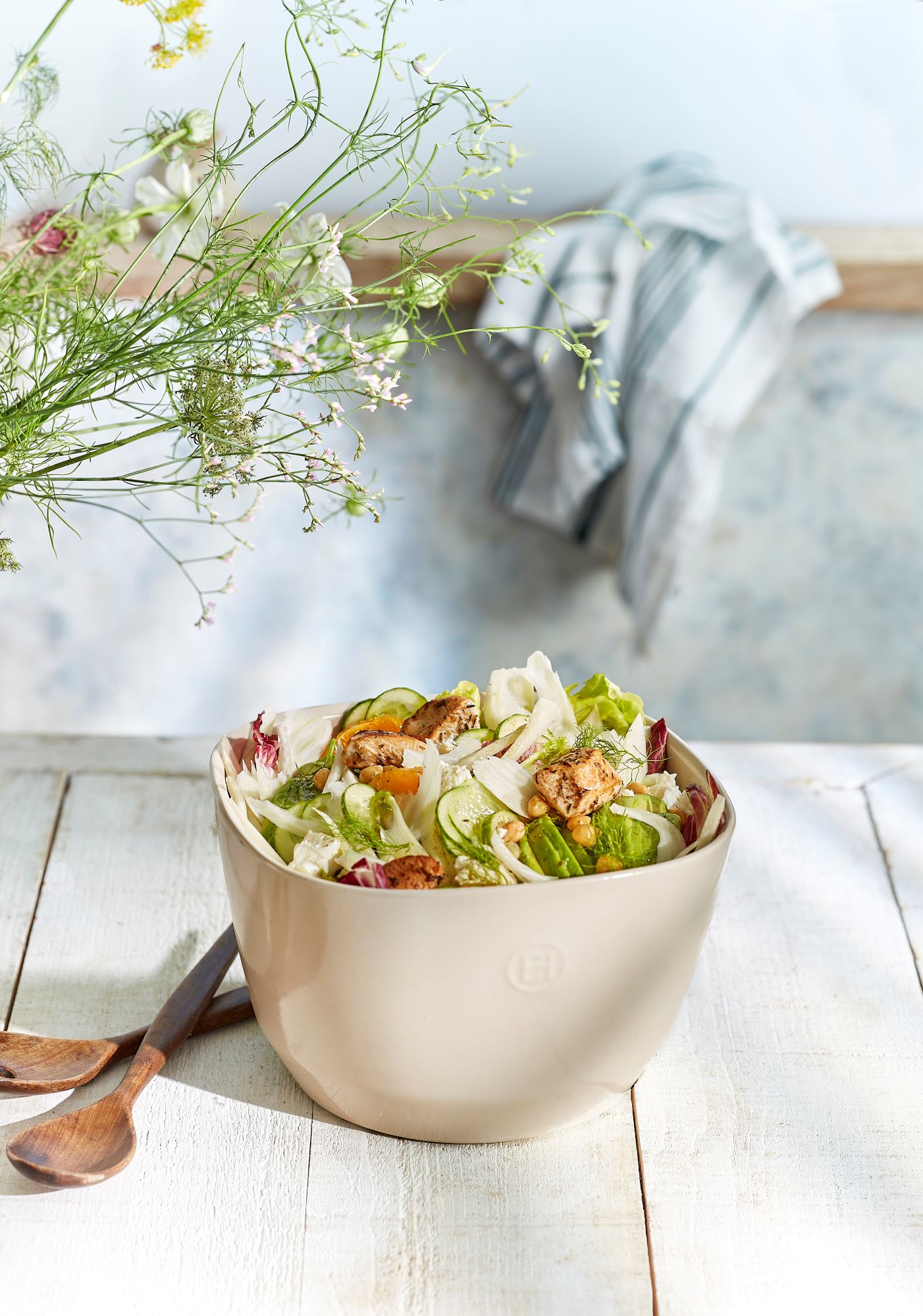 HR Keramiek® (Hoge Weerstand), ontwikkeld in de laboratoria van Emile Henry, is bestand tegen temperaturen tot 270°C en verdeelt de warmte gelijkmatig over het gehele oppervlak van de kom. Het glazuur dat in de afwerking van de kom wordt gebruikt, beschermt hem tegen krassen en afbrokkelen (je kunt direct op de kom snijden zonder hem te krassen), waardoor hij vaatwasmachinebestendig is.