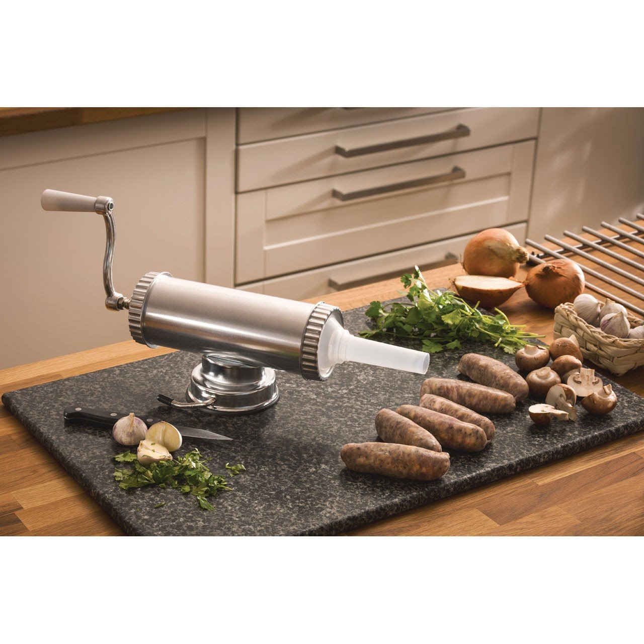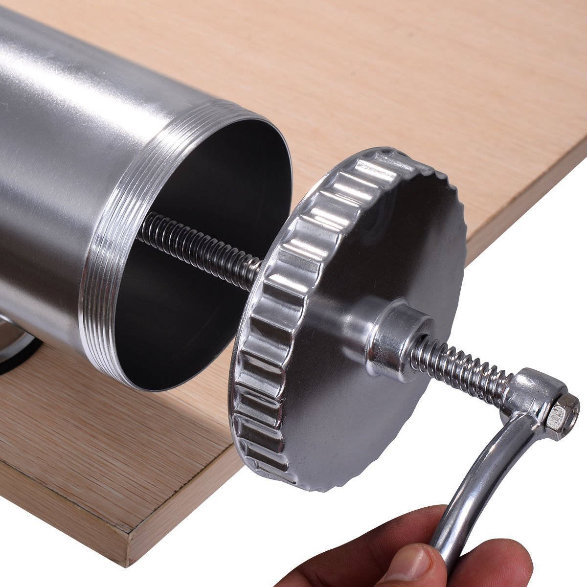 Met dit apparaat, gemaakt van aluminium , kunt u eenvoudig en snel een grote hoeveelheid worsten per keer bereiden. De koker heeft een capaciteit van 2,5 kg.