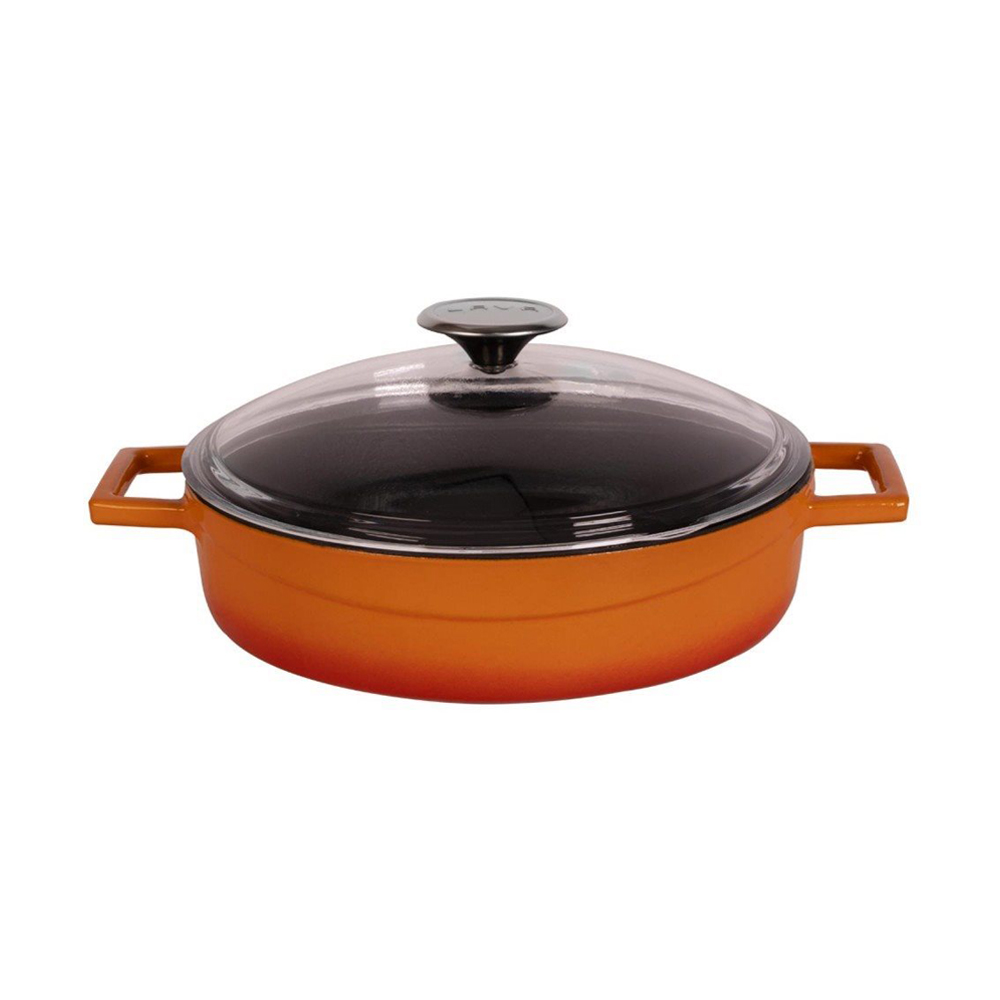 Gryte med lokk laget av varmebestandig glass produsert av Lava, diameter på 28 cm, kapasitet på 3,5 l, laget av støpejern.