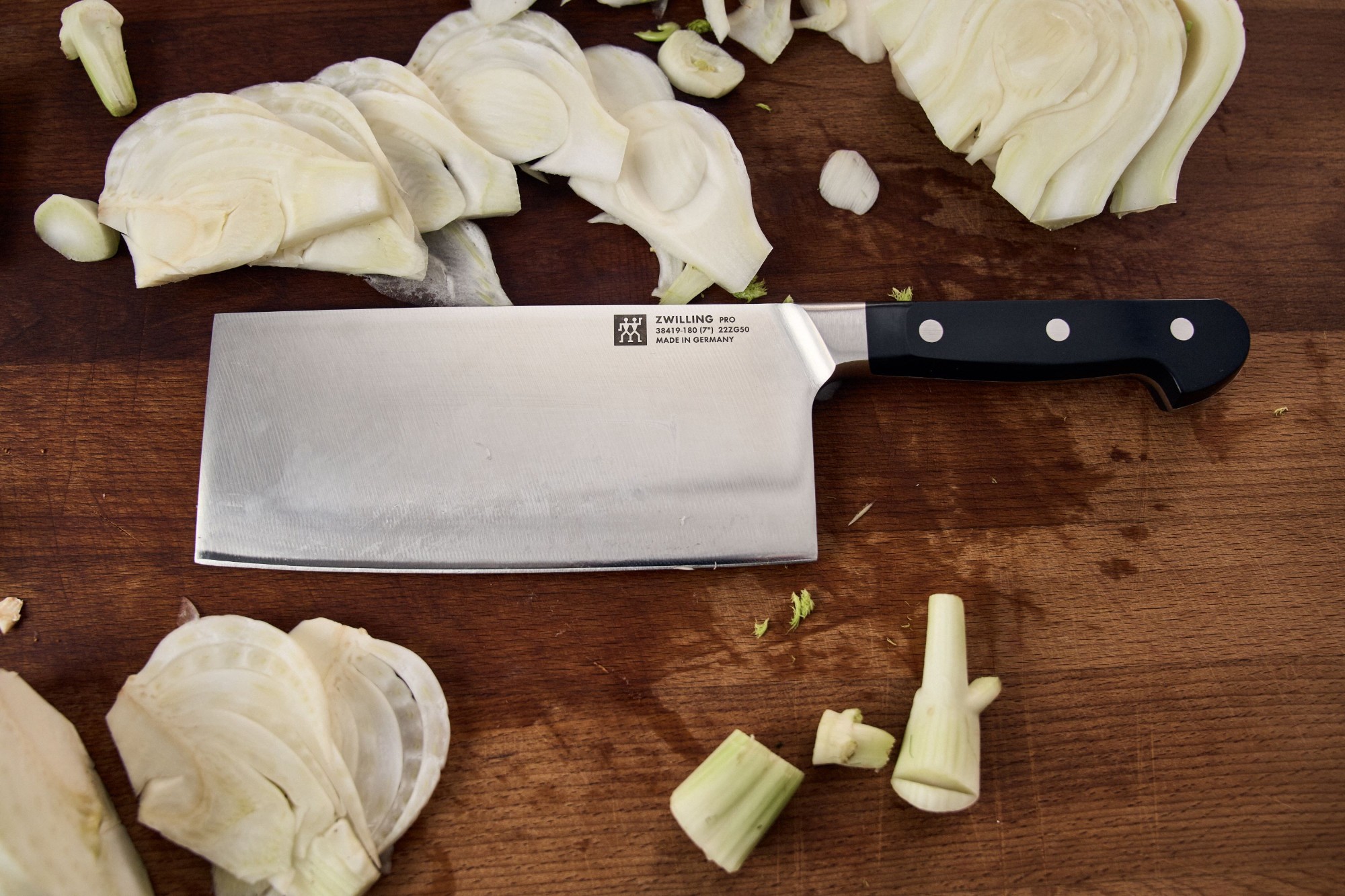 Kinesisk kokkekniv, Zwilling-merke, med et 18 cm langt blad, laget av spesielt rustfritt stål i tråd med de høyeste standarder som er korrosjonssikker og støtsikker.